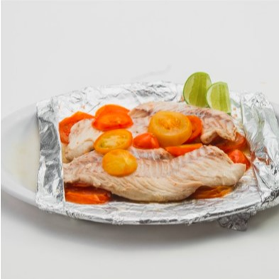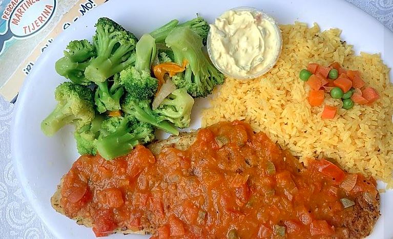 Filete de trucha, tomate, cebolla, chile morrón, aceitunas y alcaparras.