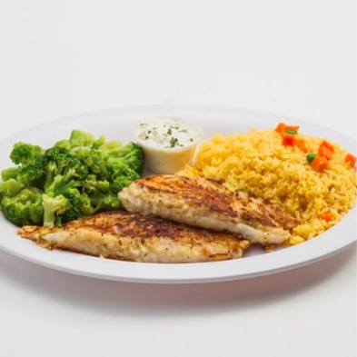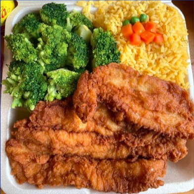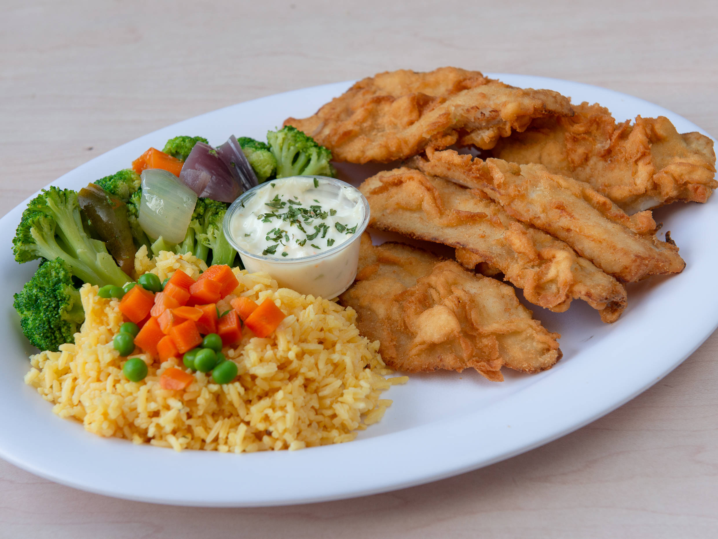 Filete de Trucha Empanizado, con arroz y verduras