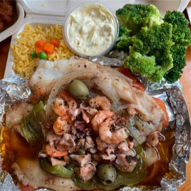 Filete, camarón, pulpo, tomate, cebolla, chile morrón, aceitunas y alcaparras.
