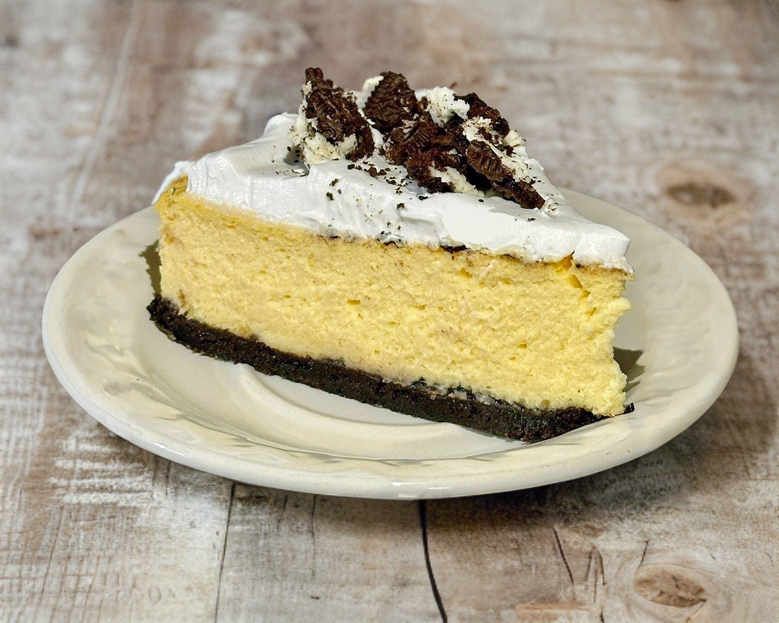 Deliciosa y cremosa capa de queso crema sobre una base crujiente de galleta Oreo, con trozos de galleta en cada bocado.