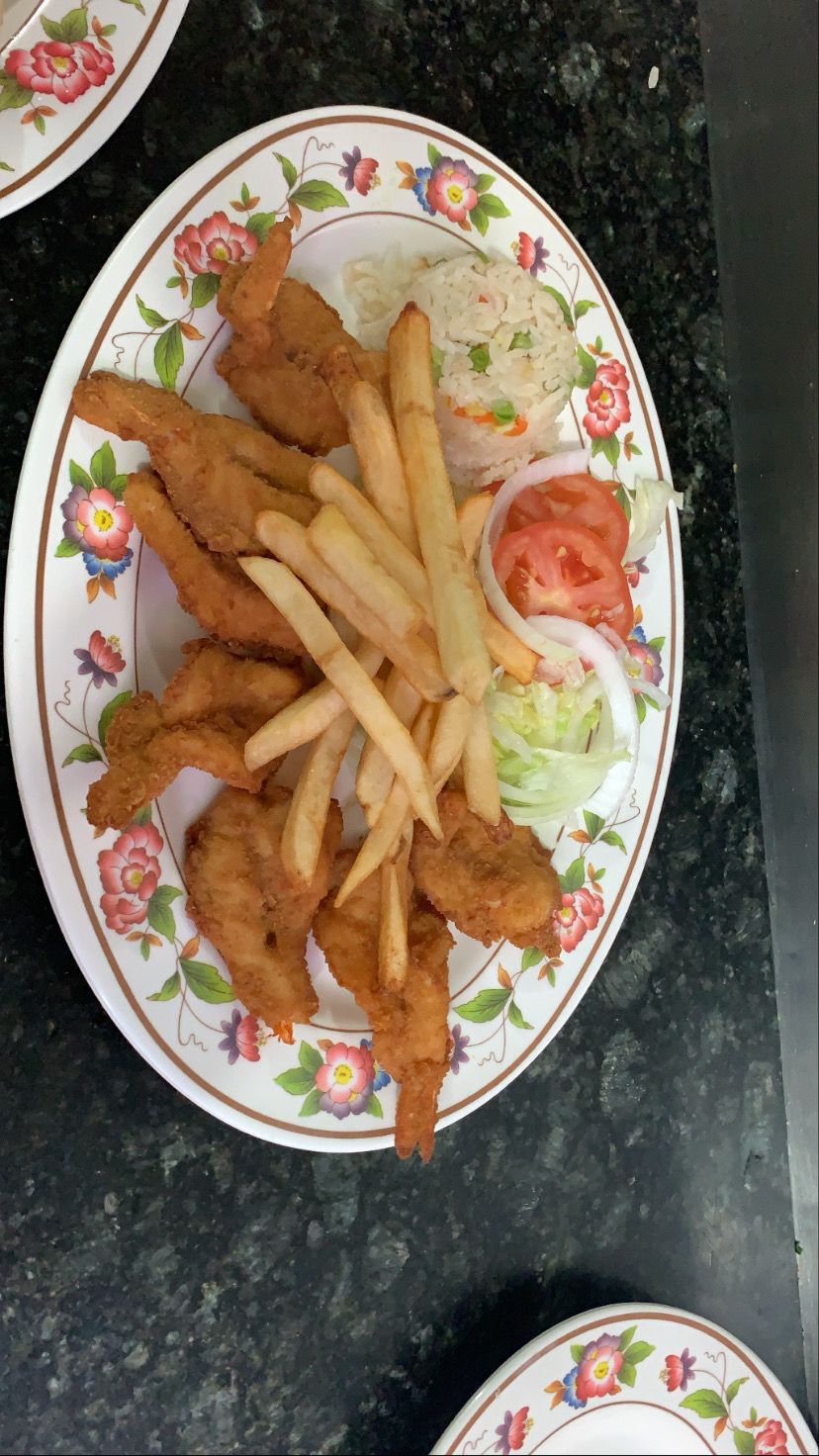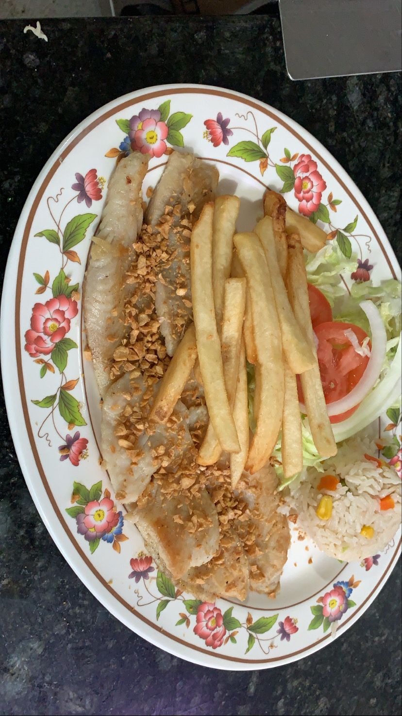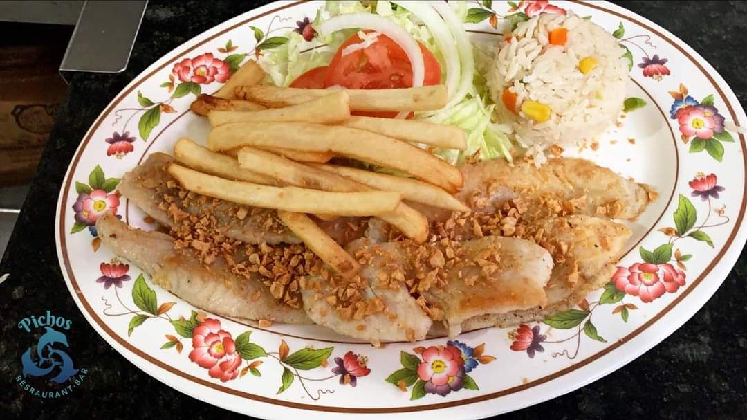 FILETE EMPANIZADO O PLANCHA BAÑADO DE MARISCOS AL OLIVO CON CAMBRAY ACOMPAÑADO DE ARROZ PAPAS ENSALADA TOTOPOS GALLETAS ADEREZO SALSAS Y LIMONES