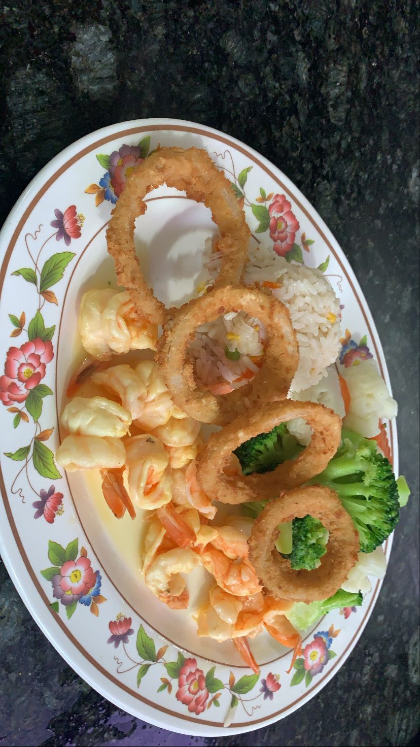 8 CAMARONES AL CAMBRAY , ACOMPAÑADO DE ENSALADA AGUACATE Y ARROZ