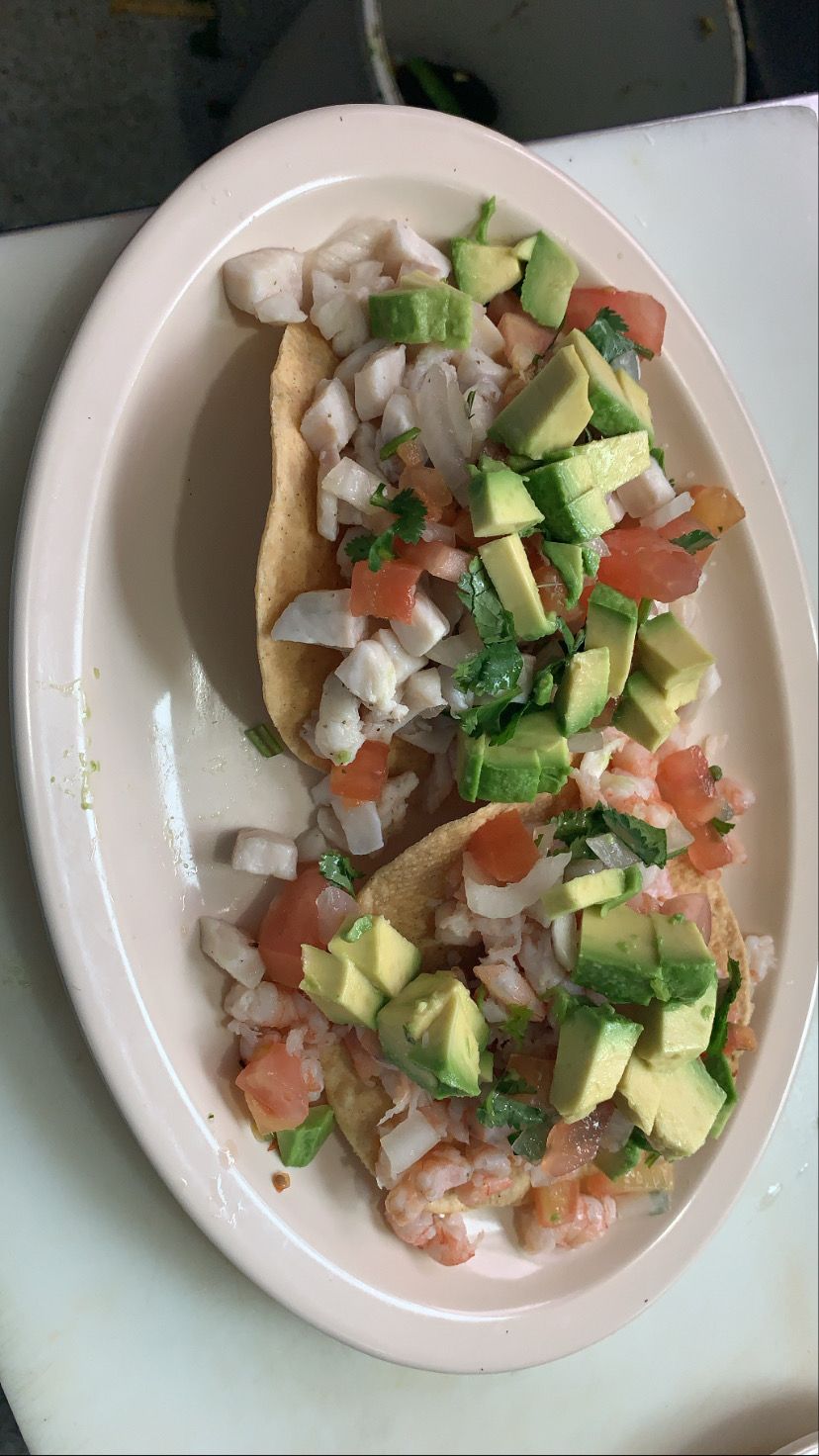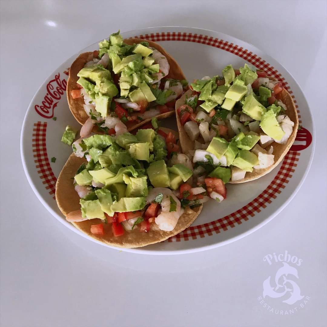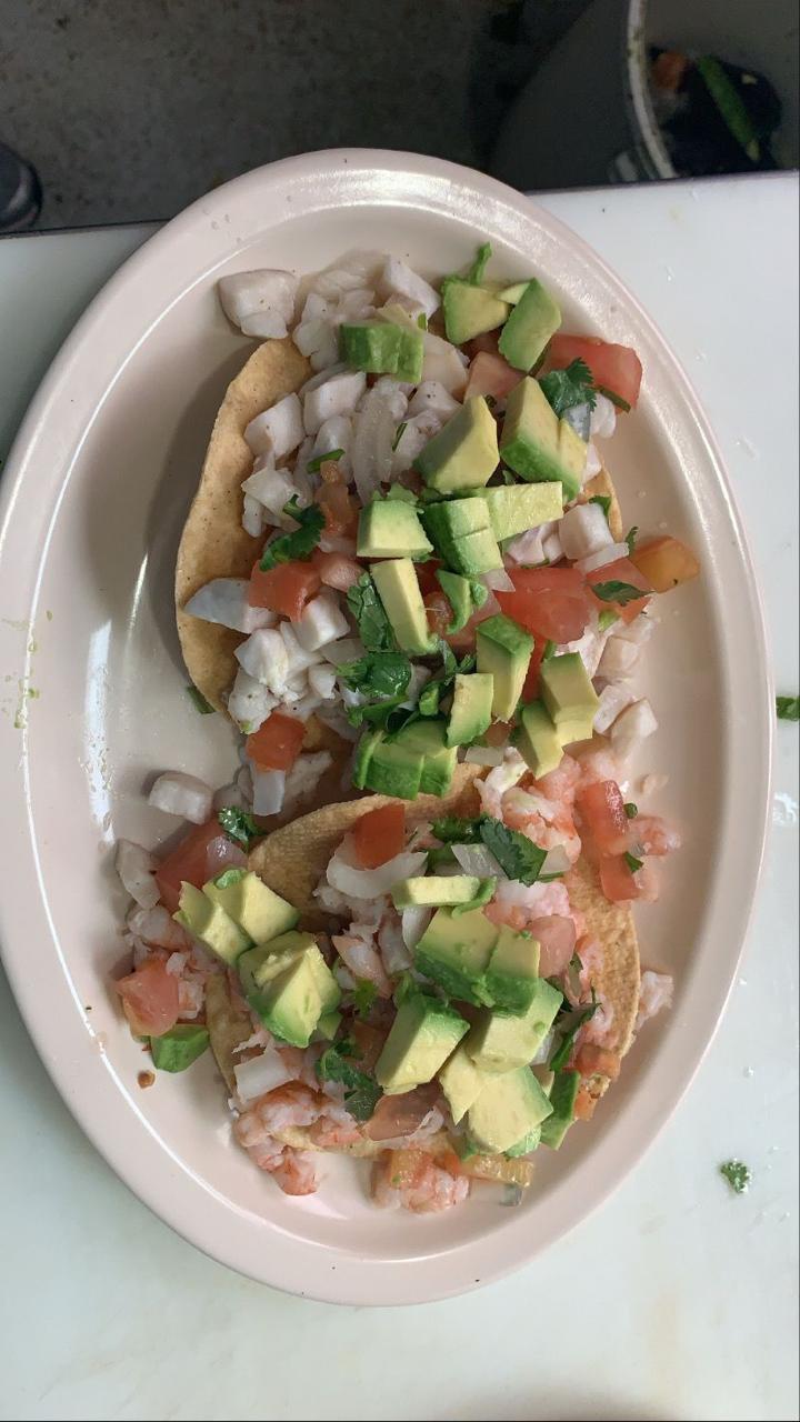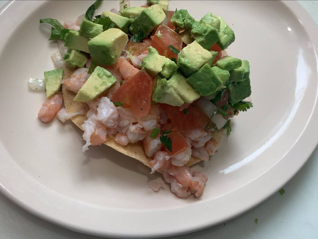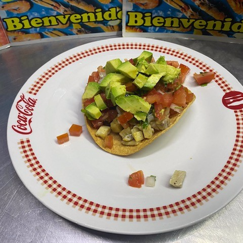 TOSTADA DE CAMARON Y CEVICHE CON PICO DE GALLO Y AGUACATE , ACOMPAÑADO DE TOTOPOS GALLETAS Y SALSA