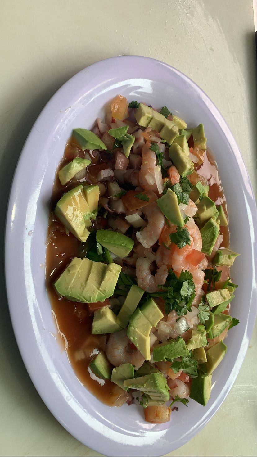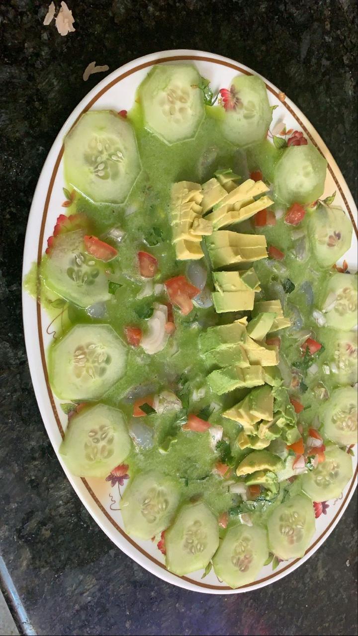 camarron, pepino cebolla y aguacate bañado en salsa de limon con chile acompañado de totopos, salsa, limomes y aderezo