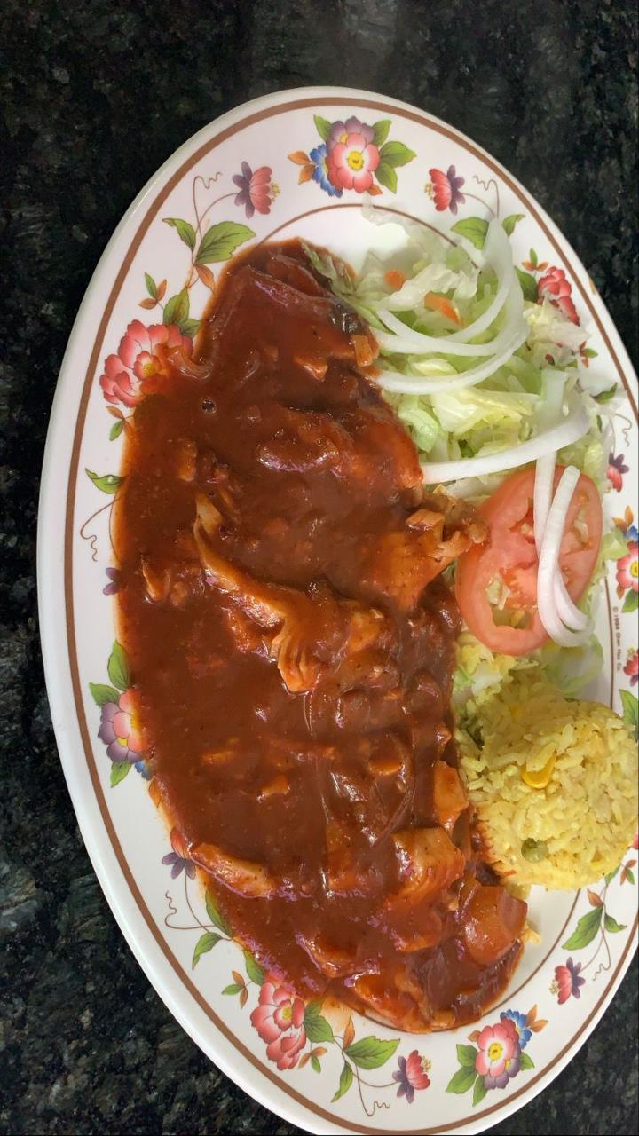 Filete bañado en salsa de tomate cebolla y chile, acompañado de arroz,ensalada,totopos,galletas,aderezo y limones