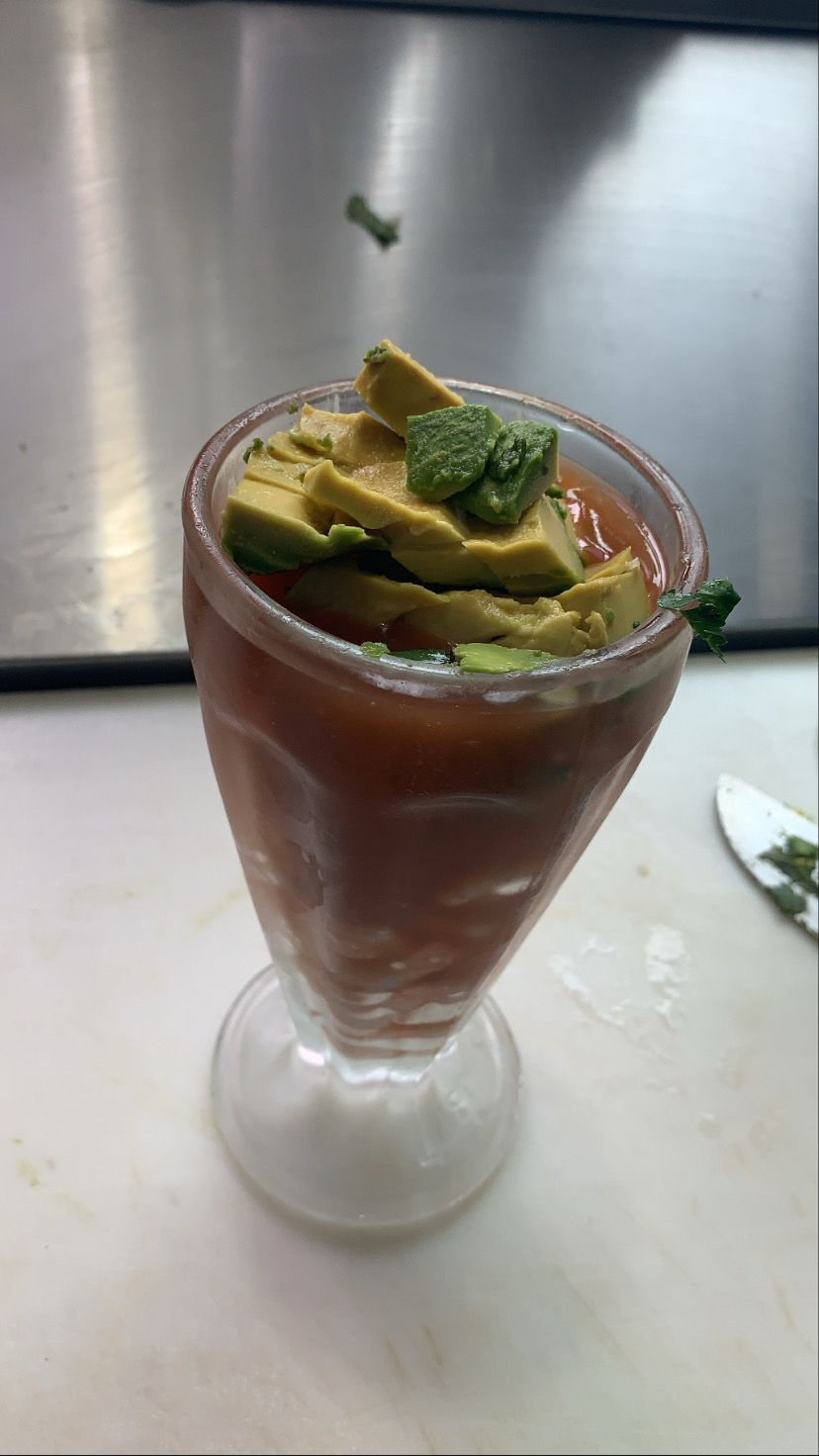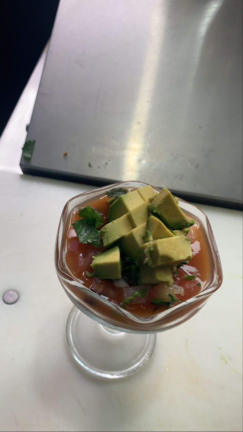 1/2 litro DE CAMARON CON PULPO PICO DE GALLO Y AGUACATE , ACOMPAÑADO DE TOTOPOS GALLETAS LIMON Y SALSA