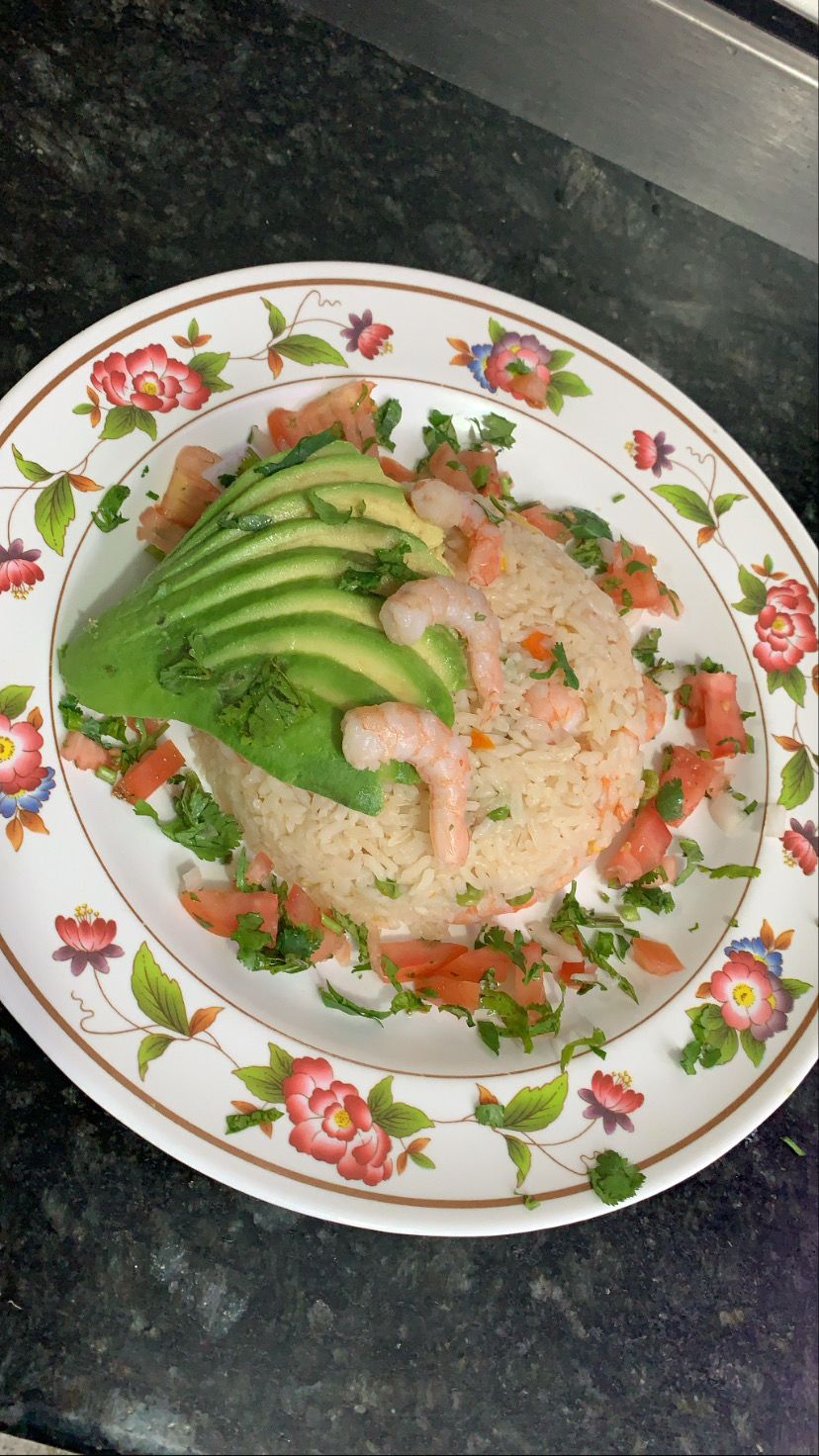 8 CAMARONES BAÑADOS EN SALSA MEXICANA , ACOMPAÑADO DE ENSALADA AGUACATE Y ARROZ