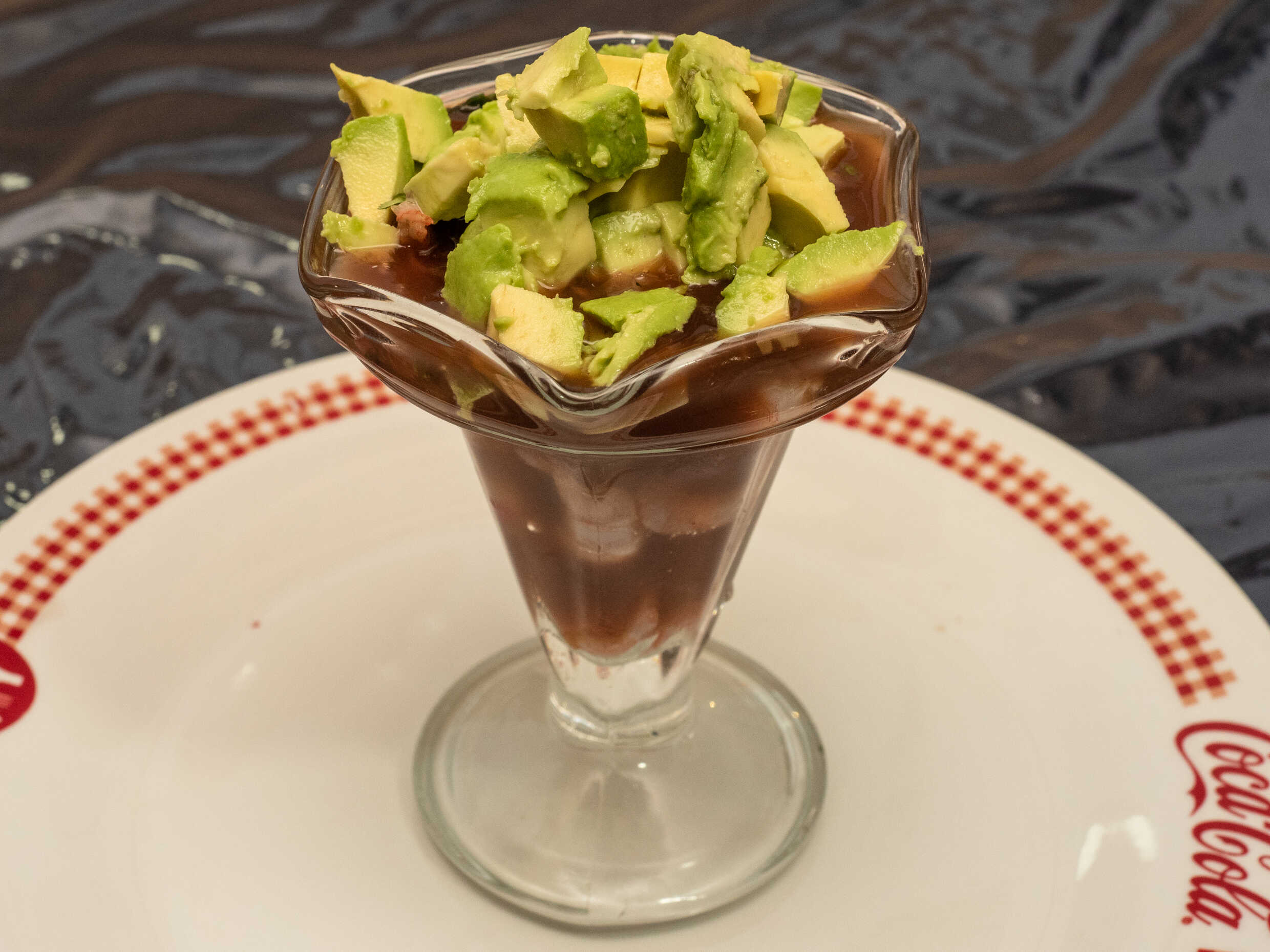 camaron, pulpo y surimi, acompañado de pico de gallo y aguacate, bañado con un toque de salsa catsup,totopos,galletas,aderezo,salsas y limones