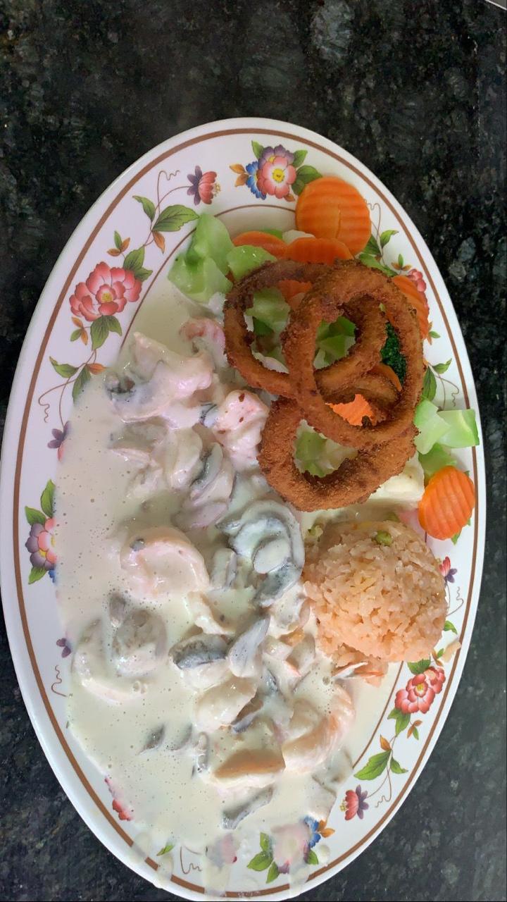 8 CAMARONES BAÑADOS EN SALSA PHILADELPHIA CON CHAMPIÑONES , ACOMPAÑADO DE ENSALADA AGUACATE Y ARROZ