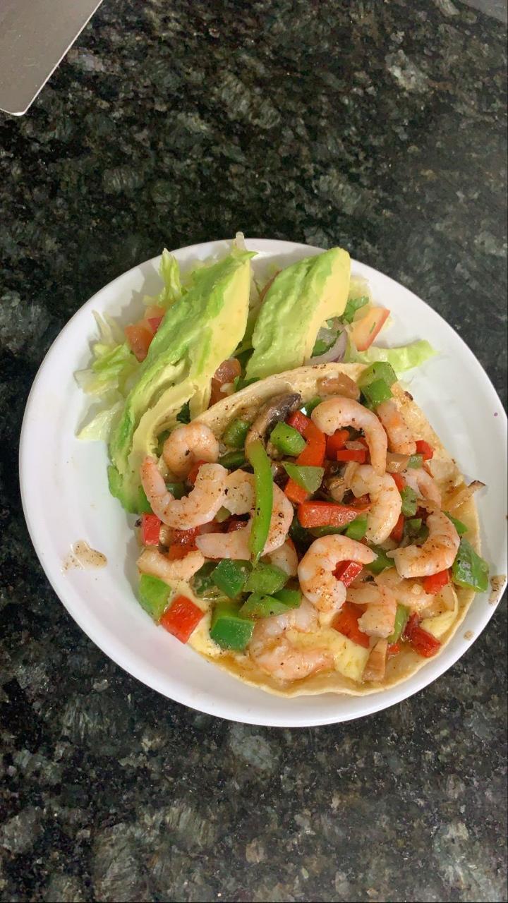 QUESADILLA CON CAMARON BAÑADO EN DIABLA , ACOMPAÑADP DE PAPAS PICO DE GALLO Y AGUACATE