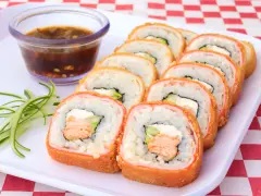 Rollo tipo california empanizado marisco a elegir camarón, surimi, salmón o pulpo.