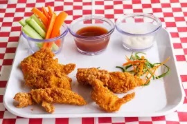 Tender de pollo dorados y bañados en la salsa de tu elección. Acompañados de bastones de zanahoria y apio con aderezo ranch.
