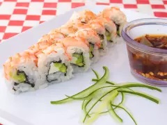 Rollo tipo california con camarón por fuera y por dentro pepino, aguacate y queso crema.