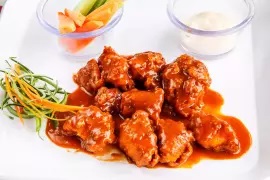 Boneless de pollo dorados y bañados en la salsa de tu elección. Acompañado de bastones de zanahoria y apio con aderezo ranch.