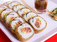 Rollo tipo futomaki con arroz frito y camarón capeado.