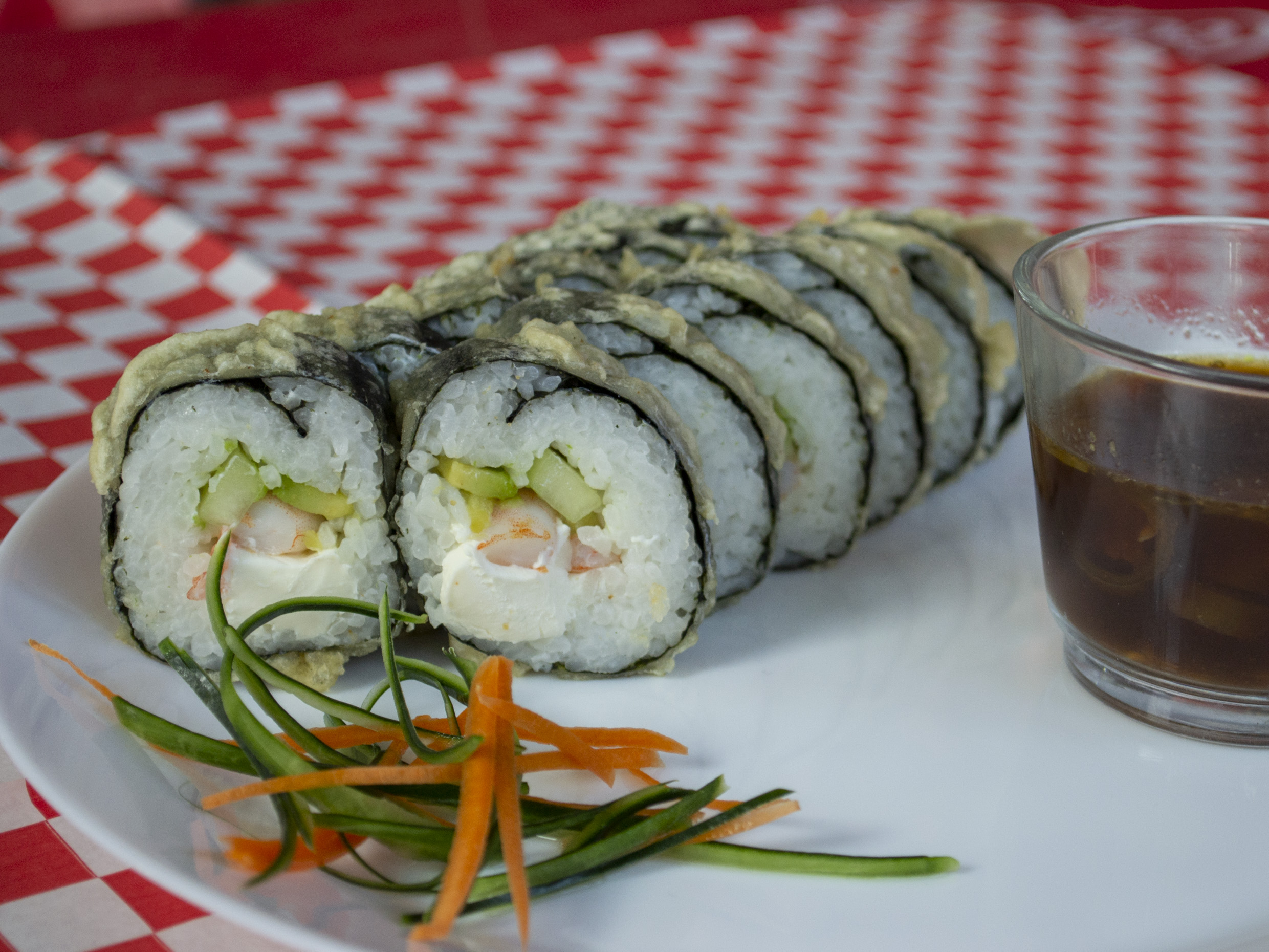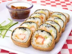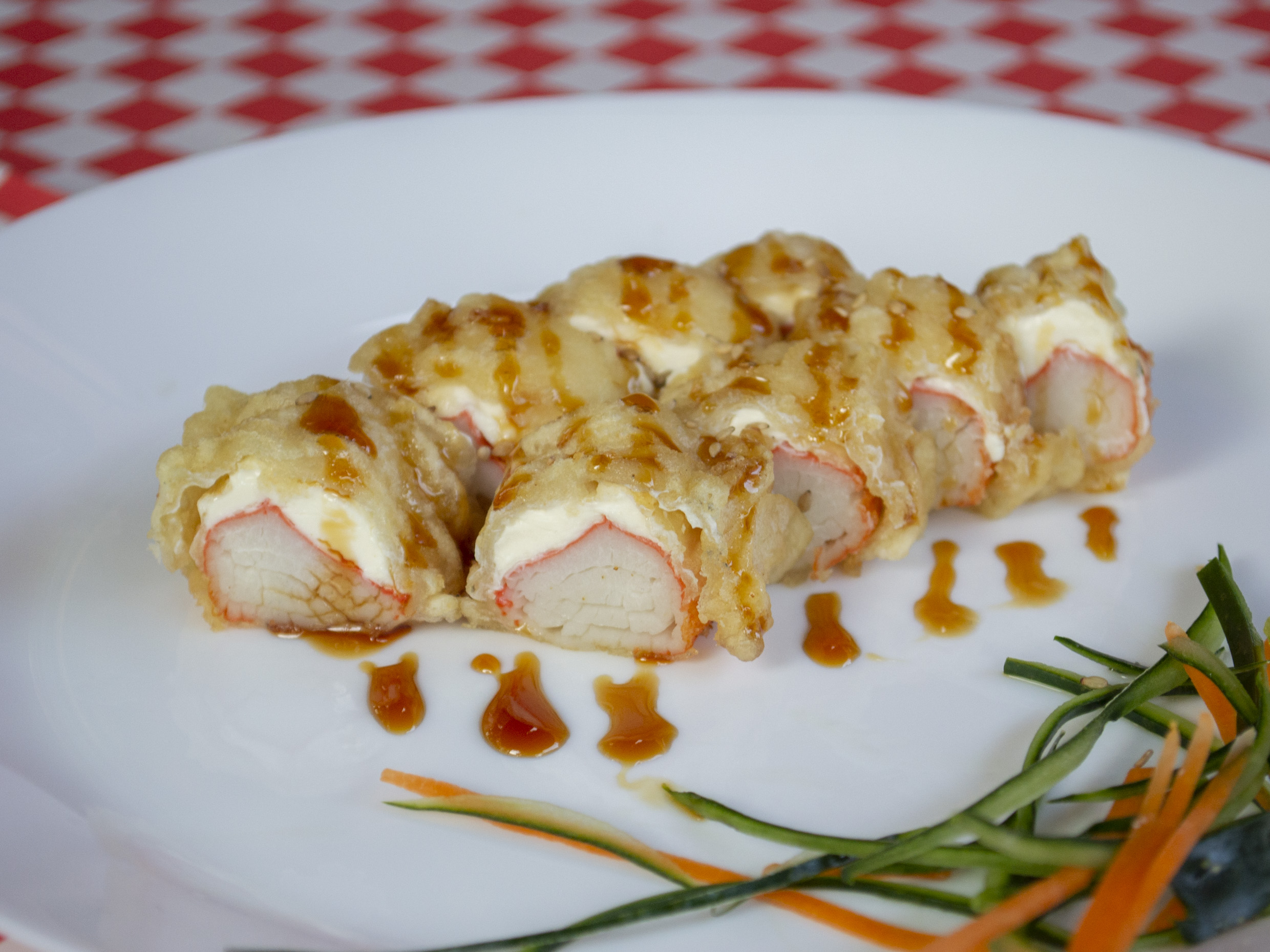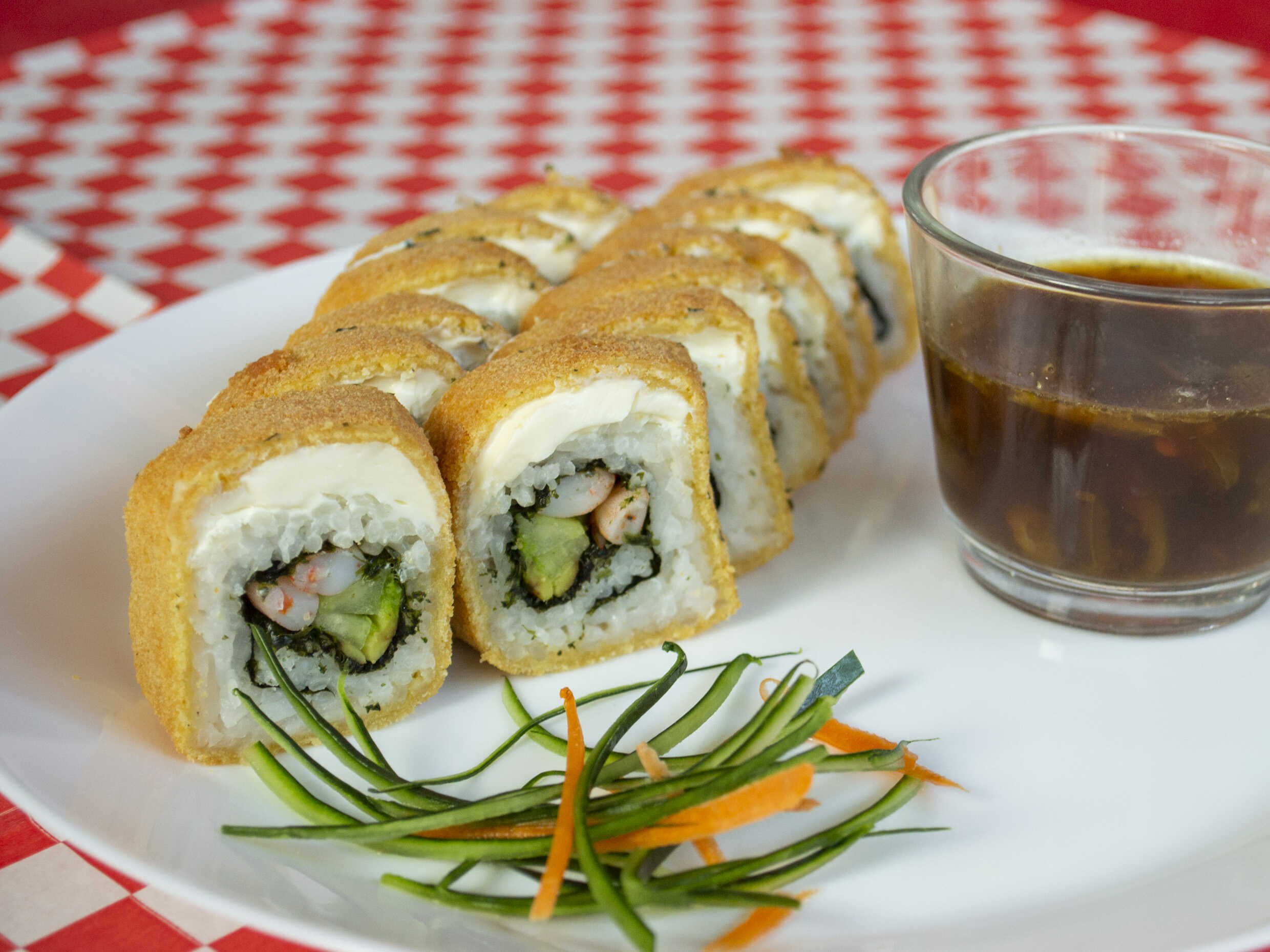 Rollo tipo california empanizado marisco a elegir camarón, surimi, salmón o pulpo.