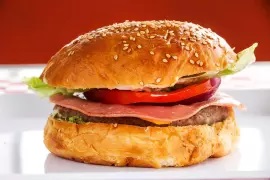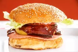 Carne de sirloin, jamón, queso, aguacate, tomate, cebolla y lechuga.