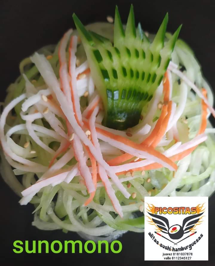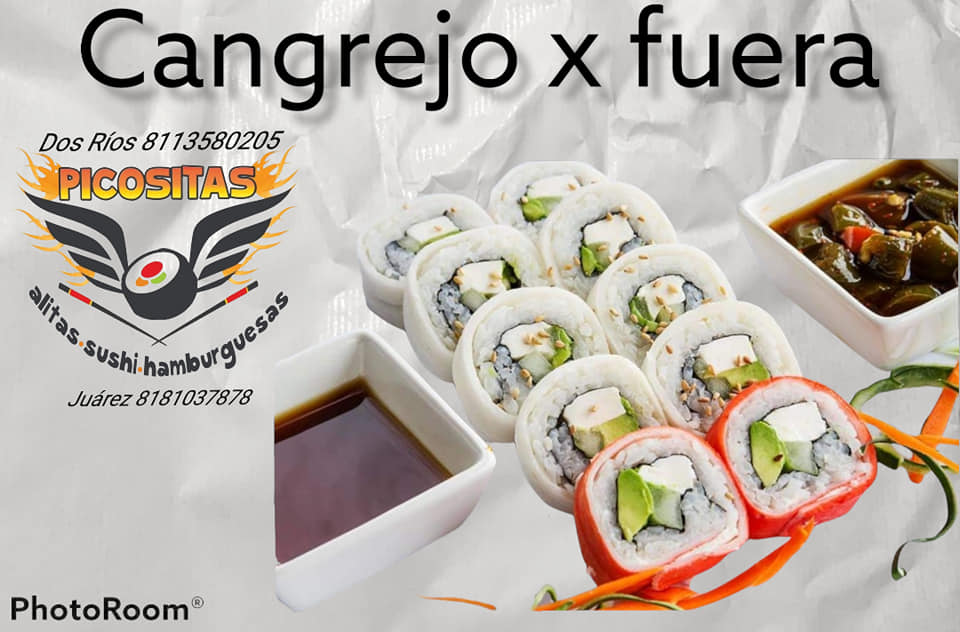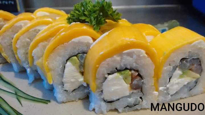 Rollo con tampico por fuera pepino, aguacate, queso crema y surimi por dentro.