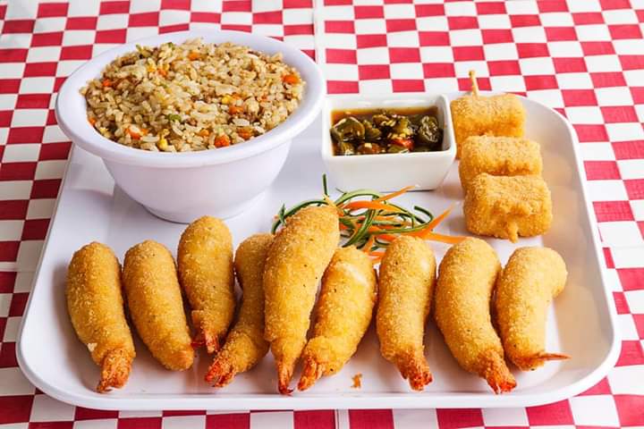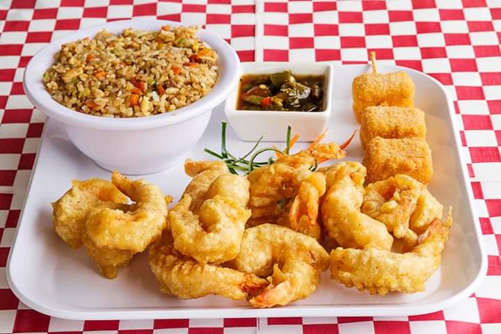 180 gr de camarones empanizados rellenos de queso crema, arroz yakimeshi y brocheta de queso crema.