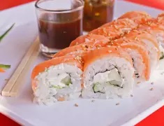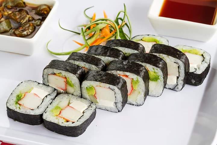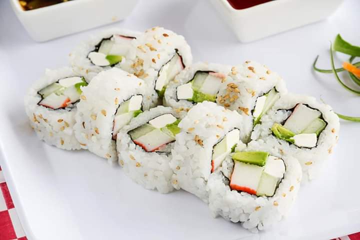 Gohan con pasta tampico o california con queso crema y ajonjolí.