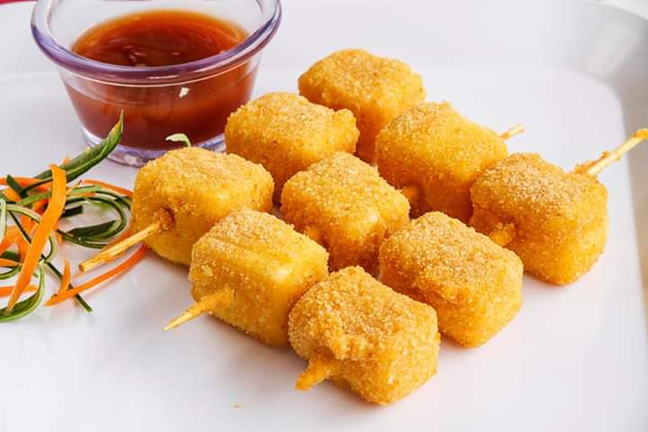 3 Brochetas con 9 cubos de queso chihuahua empanizados.