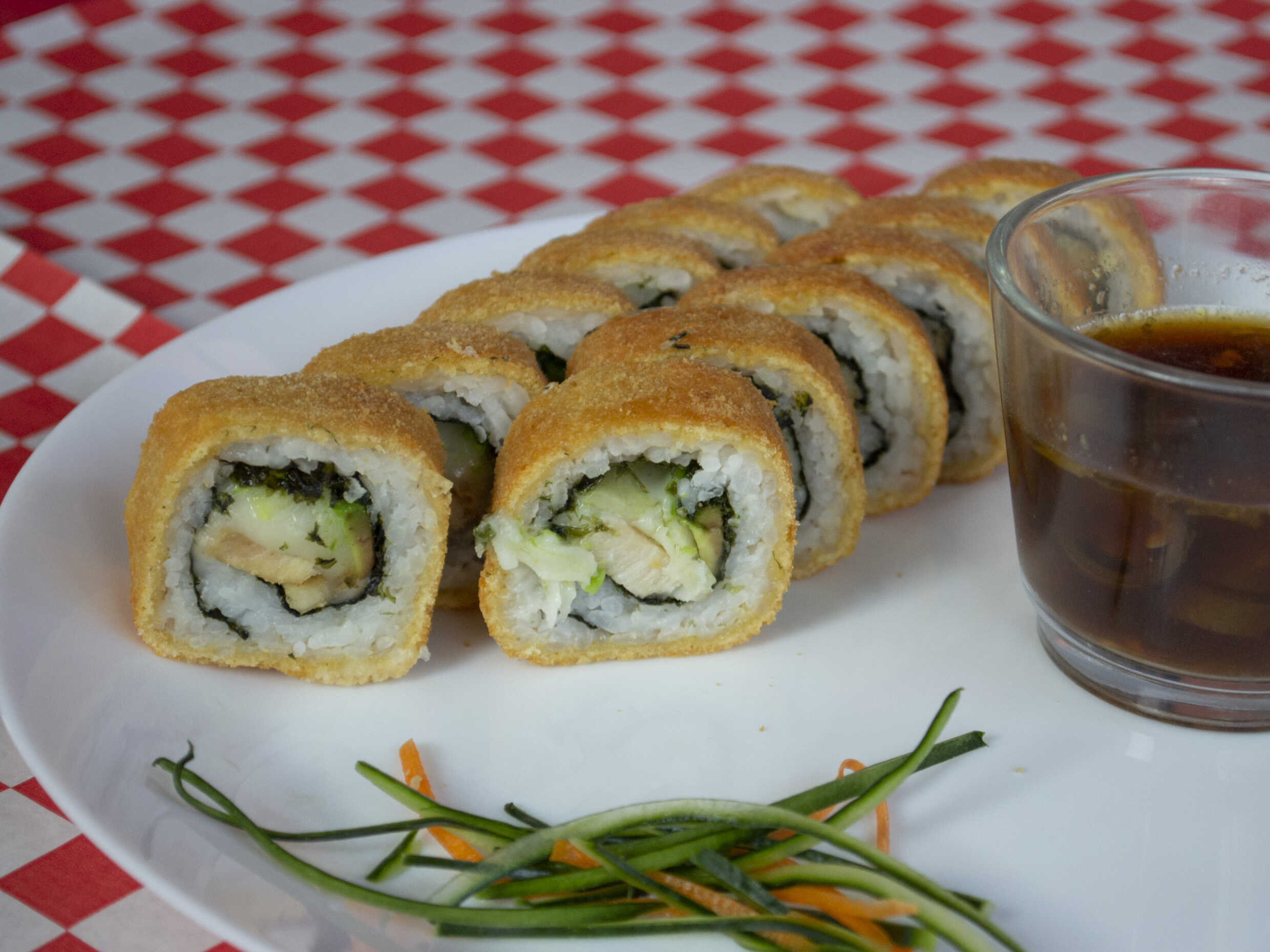 Rollo tipo california con pollo a la plancha y queso chihuahua.