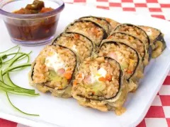 Rollo tipo futomaki con arroz frito y camarón capeado.