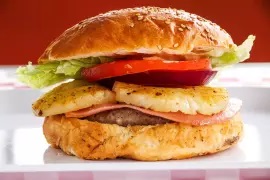 Carne de sirloin, jamón, queso, aguacate, tomate y piña asada.