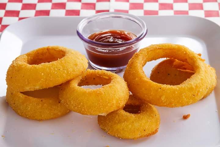 Carne de sirloin, aros de cebolla empanizados, queso y salsa BBQ.
