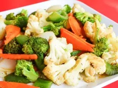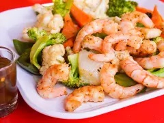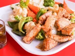 Variedad de verduras a la plancha con pollo, camarones y salmón.