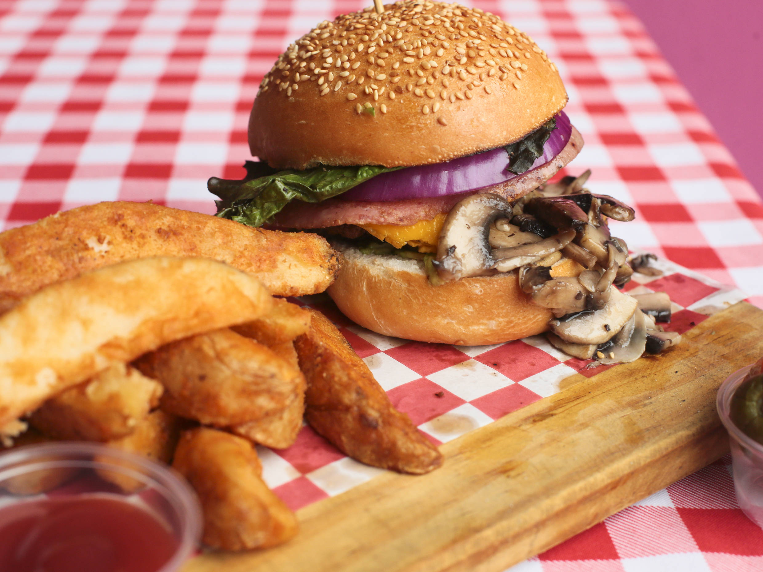 Carne de res, champiñones, jamón, queso amarillo, mayonesa, lechuga morada, cebolla morada, tomate y aguacate. Acompañada de papas gajo.
