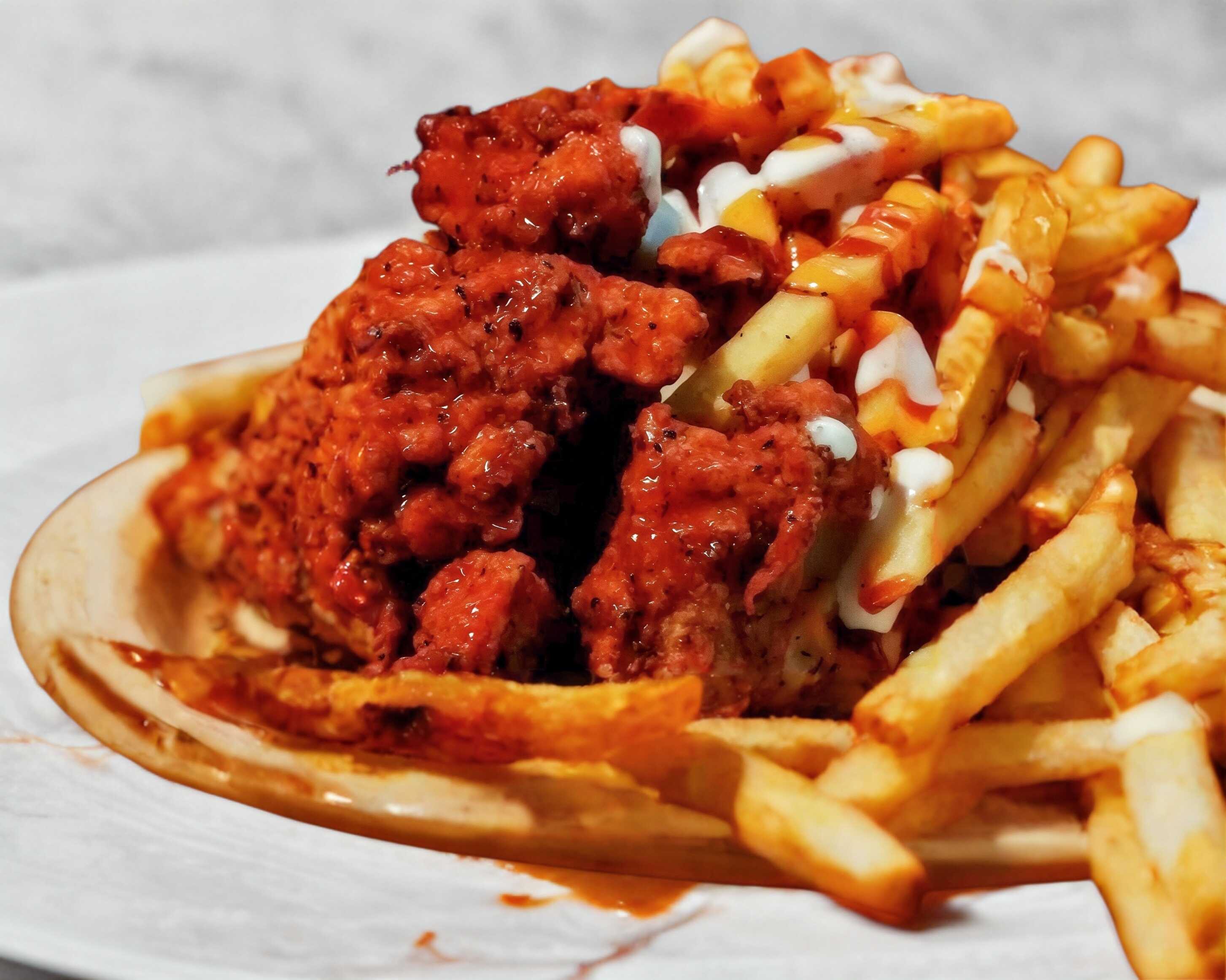 4 mega boneless bañados en salsa Red Hot acompañados de papas fritas bañadas con salsa BBQ, RANCH, QUESO