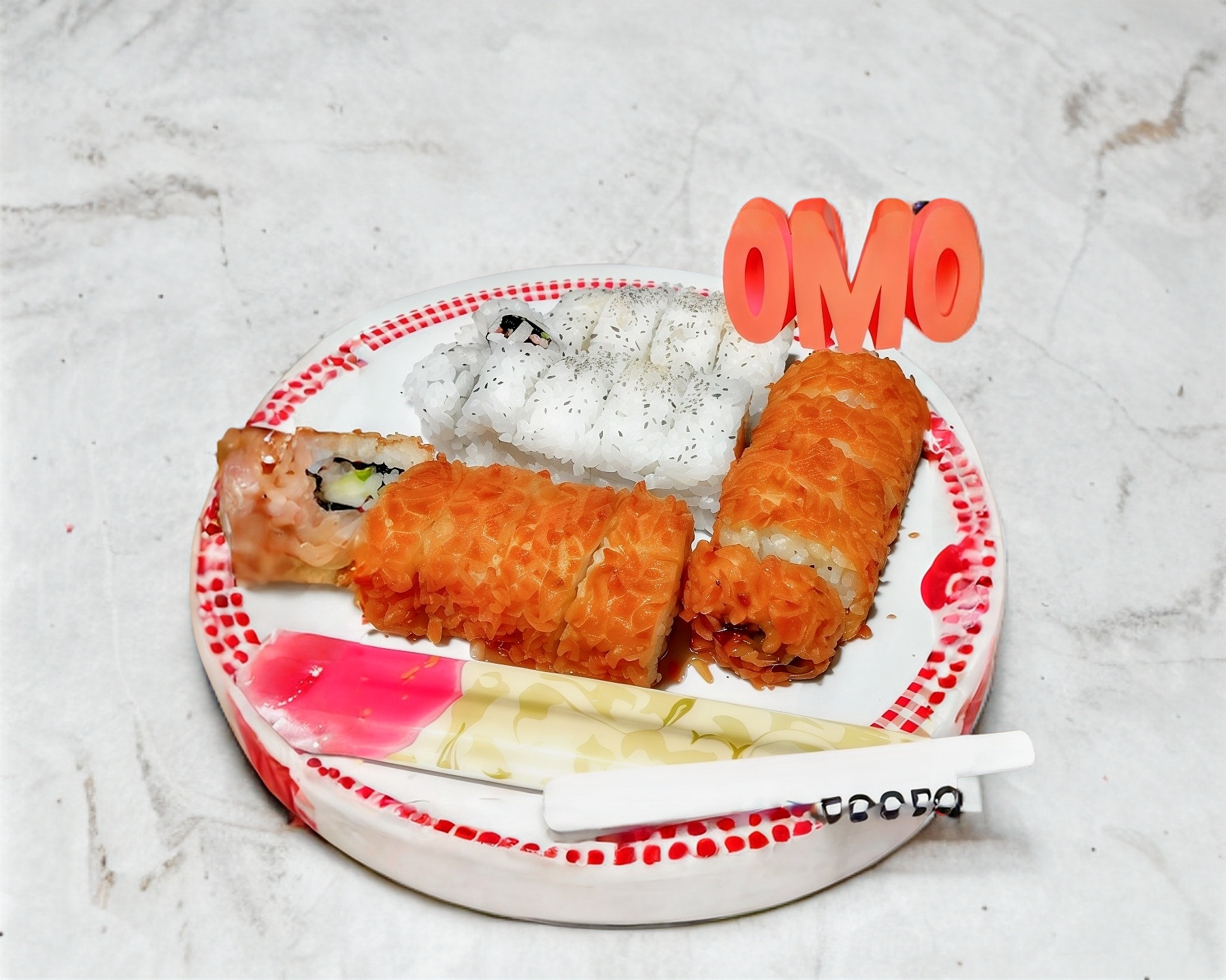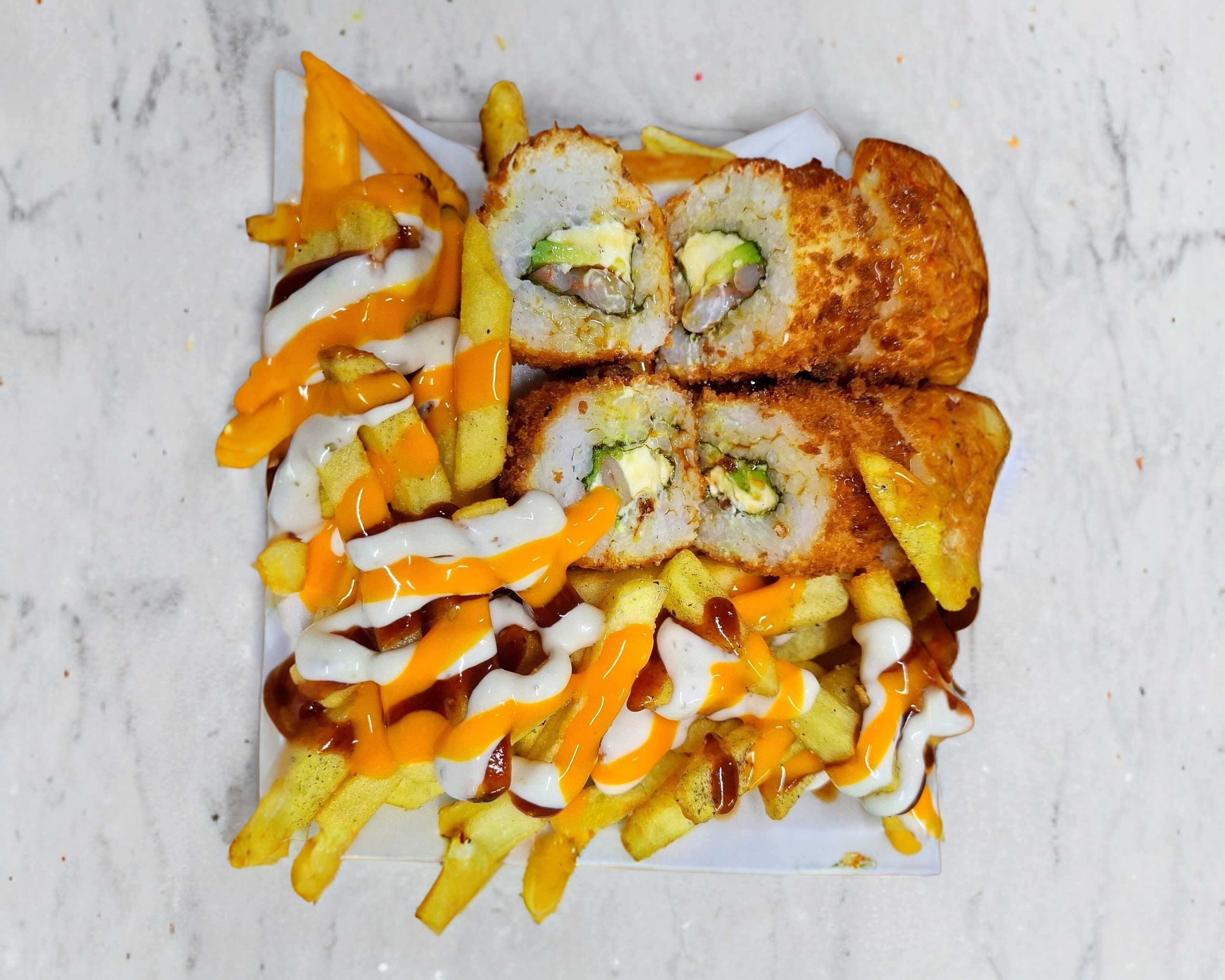 Dos rollos de sushi empanzado de camarón y sufrimiento acompañados con papas fritas bañadas con salsa BBQ,RANCH,QUESO,REDHOT