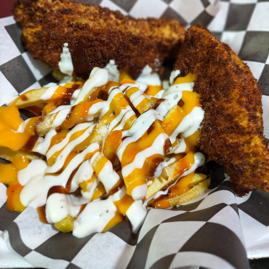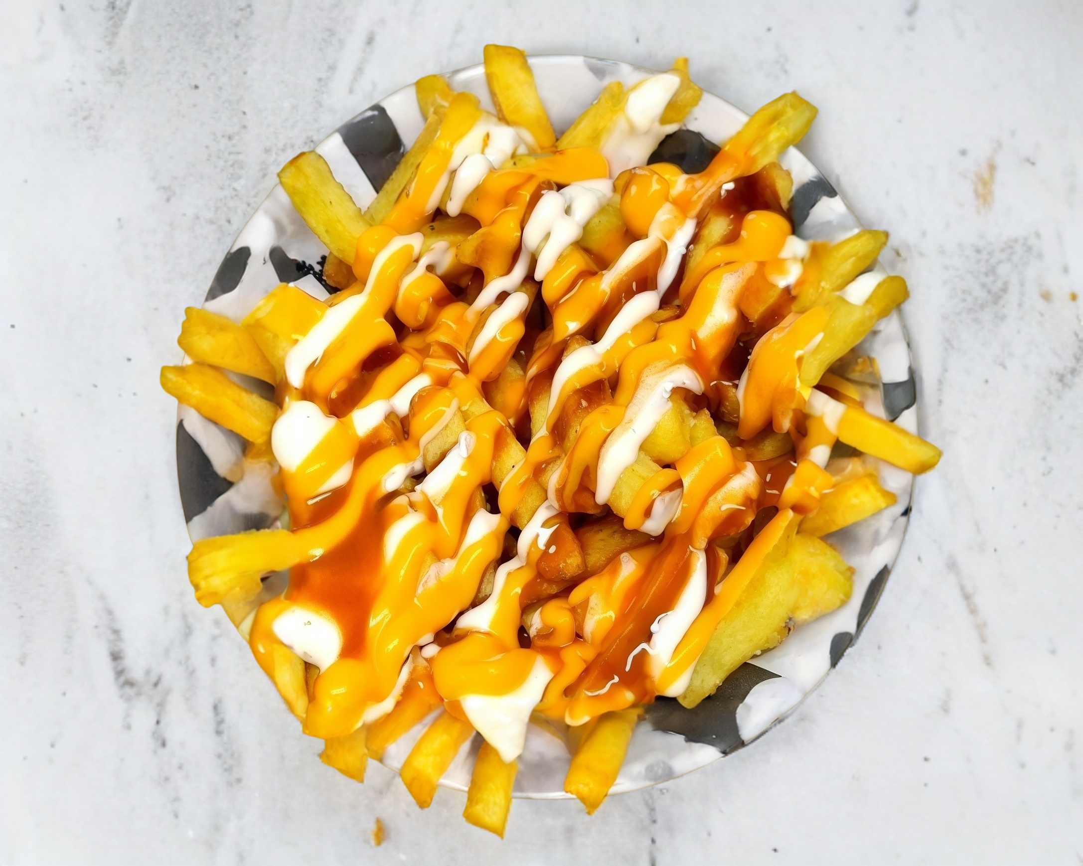 Papas fritas bañadas con salsa BBQ,RANCH,QUESO Y SALSA REDHOT