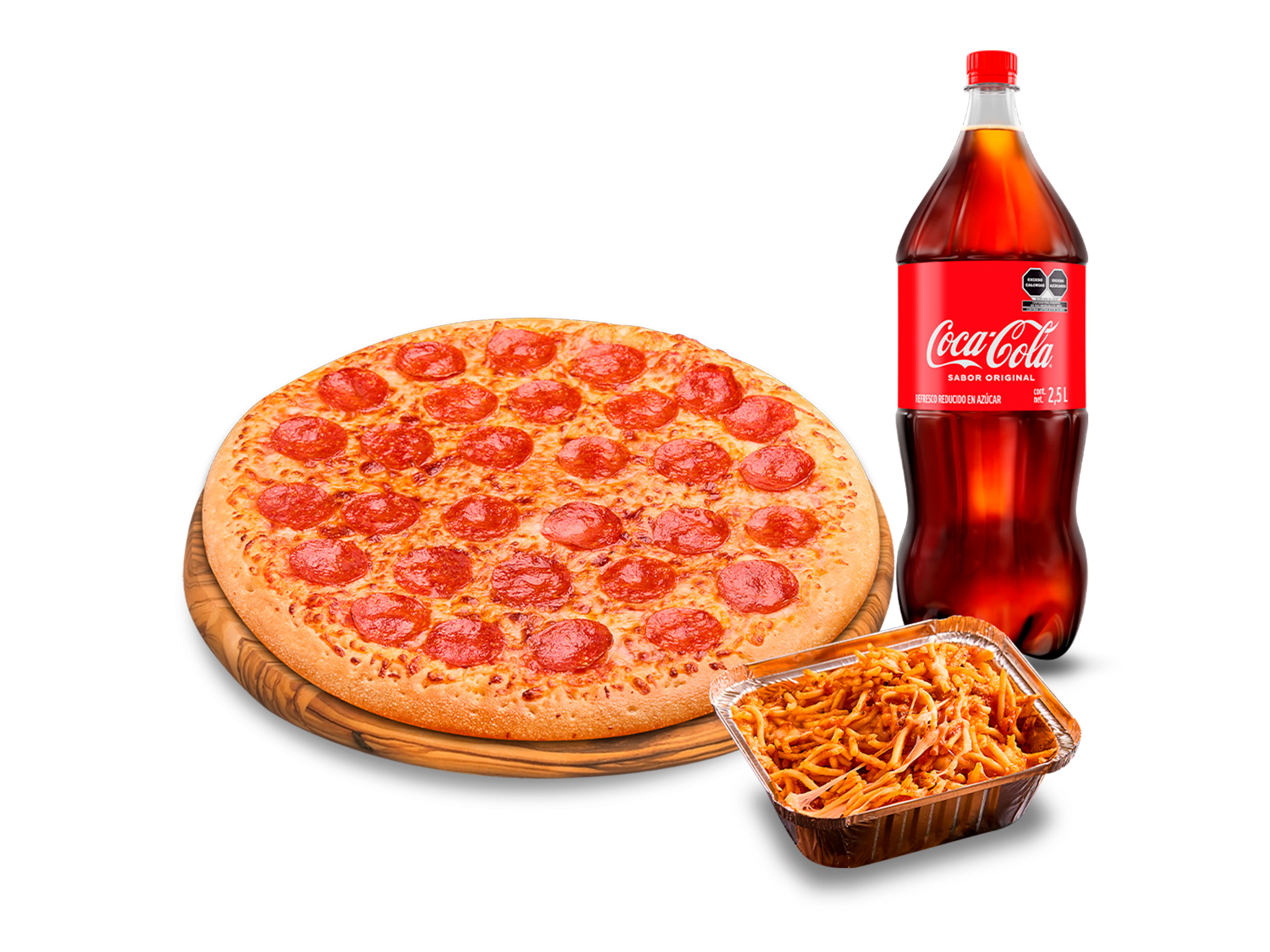 1 Pizza grande de pepperoni, papas en gajo y refresco de 2.5L