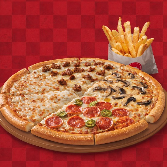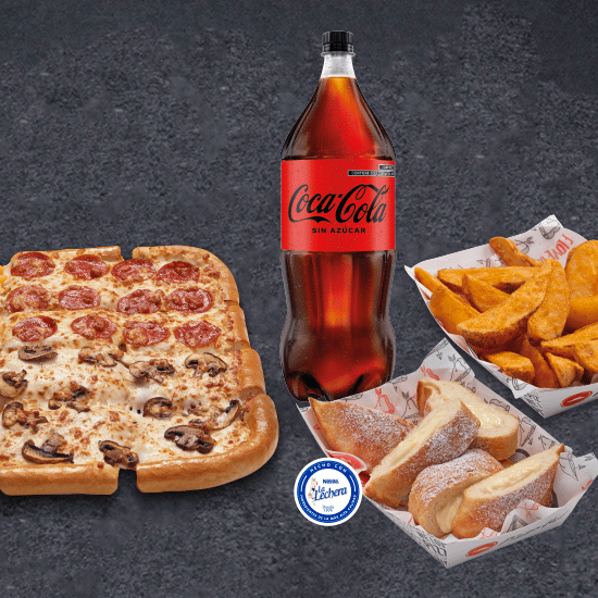 2 pizzas tradicionales tamaño mediana + 1 orden de papas a la francesa + 1 bastones de cajeta + 1 refresco familiar