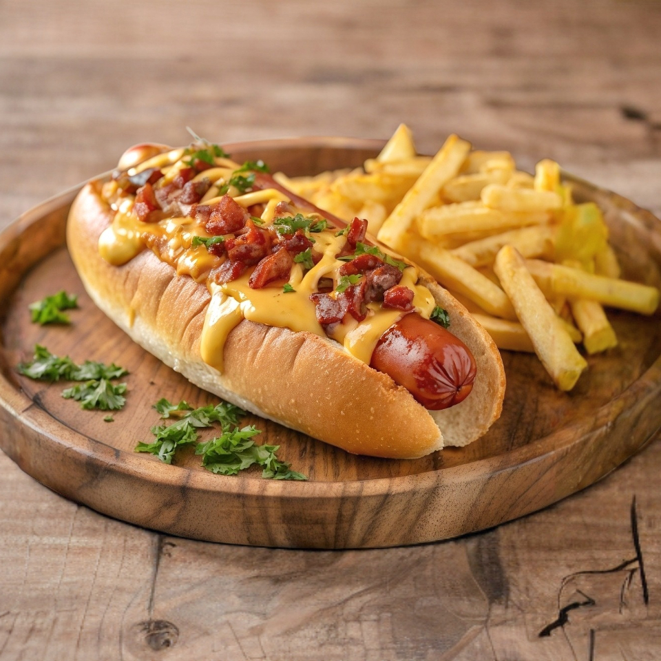 Hot dog clásico acompañado de papas fritas crujientes, perfecto para una comida completa.