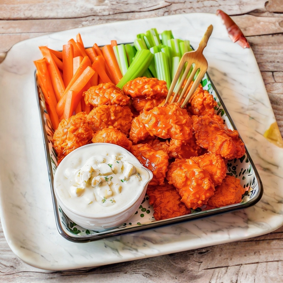 Once boneless bañados en salsa al gusto, acompañados de dos dedos de queso y aderezo ranch.