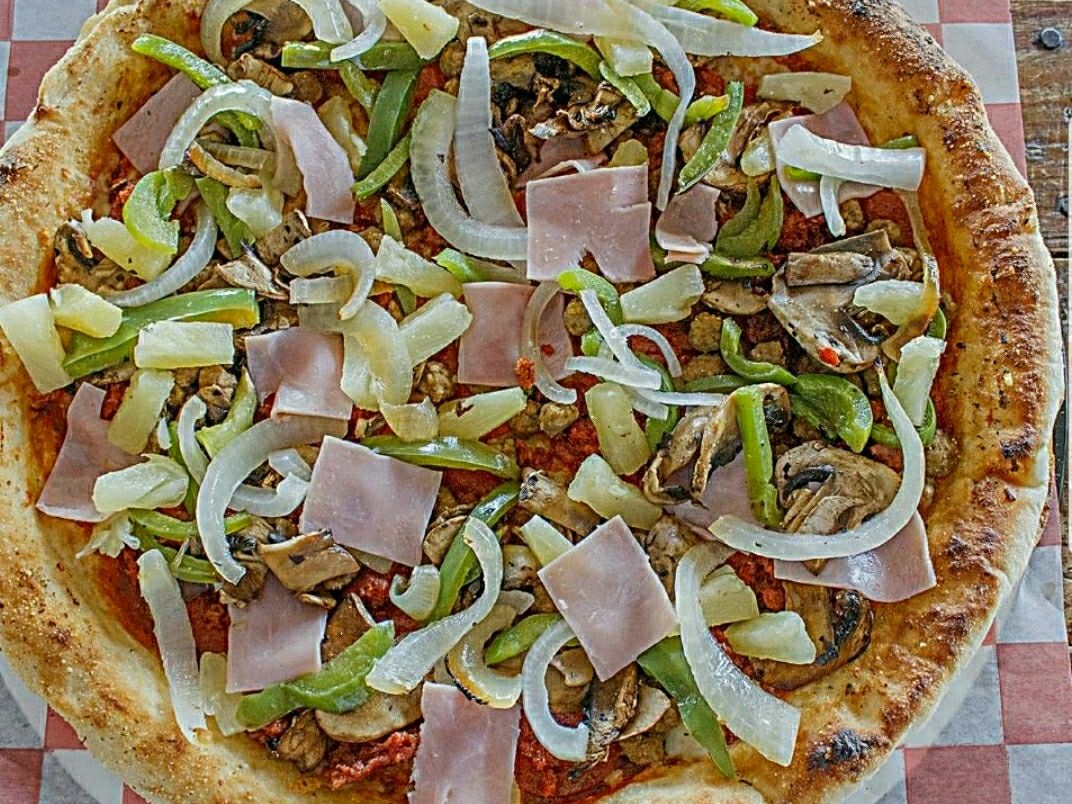 Deliciosa masa crujiente a la leña, pepperoni, jamón, pimentón verde, champiñón, cebolla, marinara de la Casa, queso mozzarella.