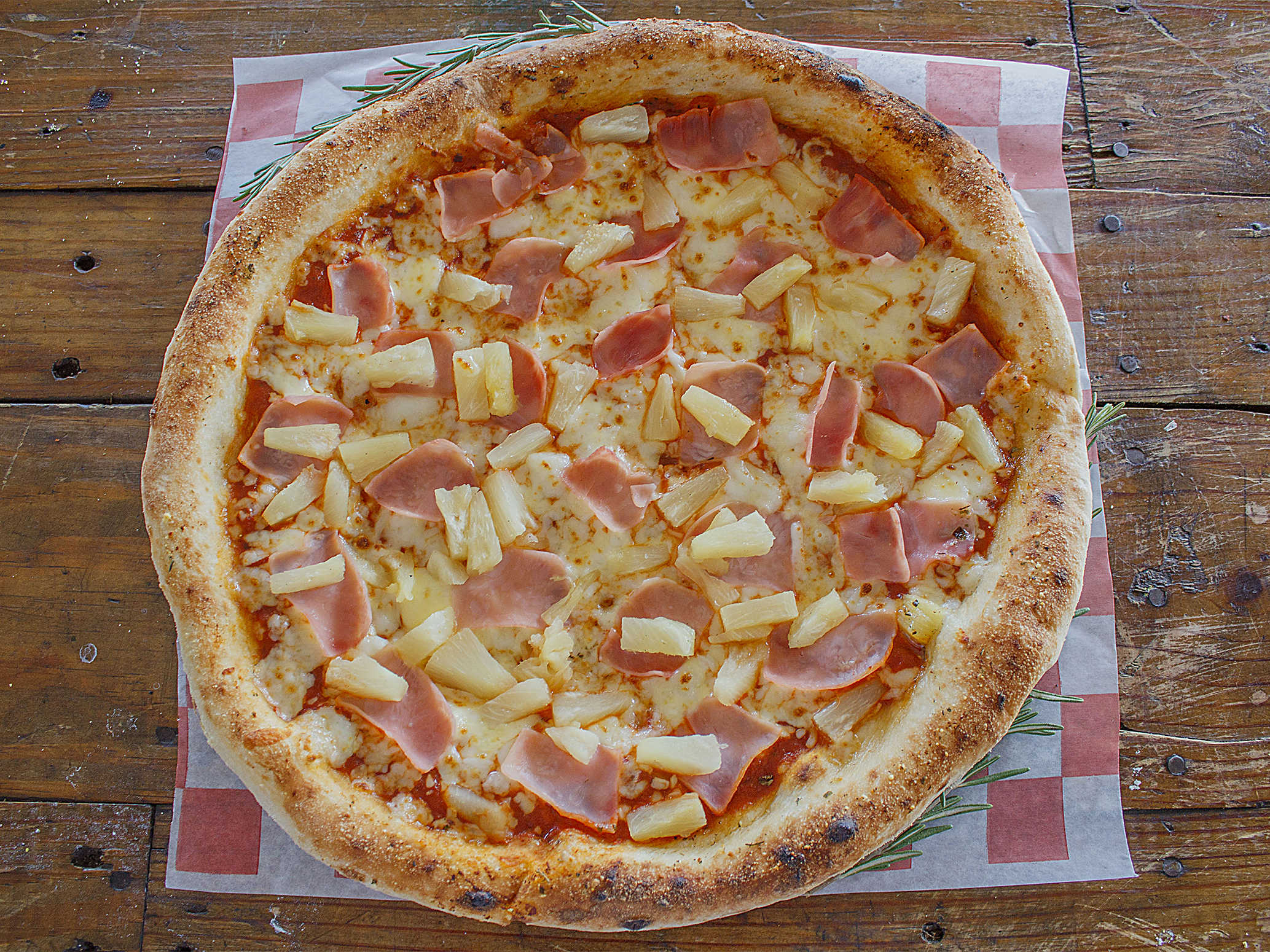 Masa crujiente, queso mozzarella, piña, jamon de pierna, marinara casera