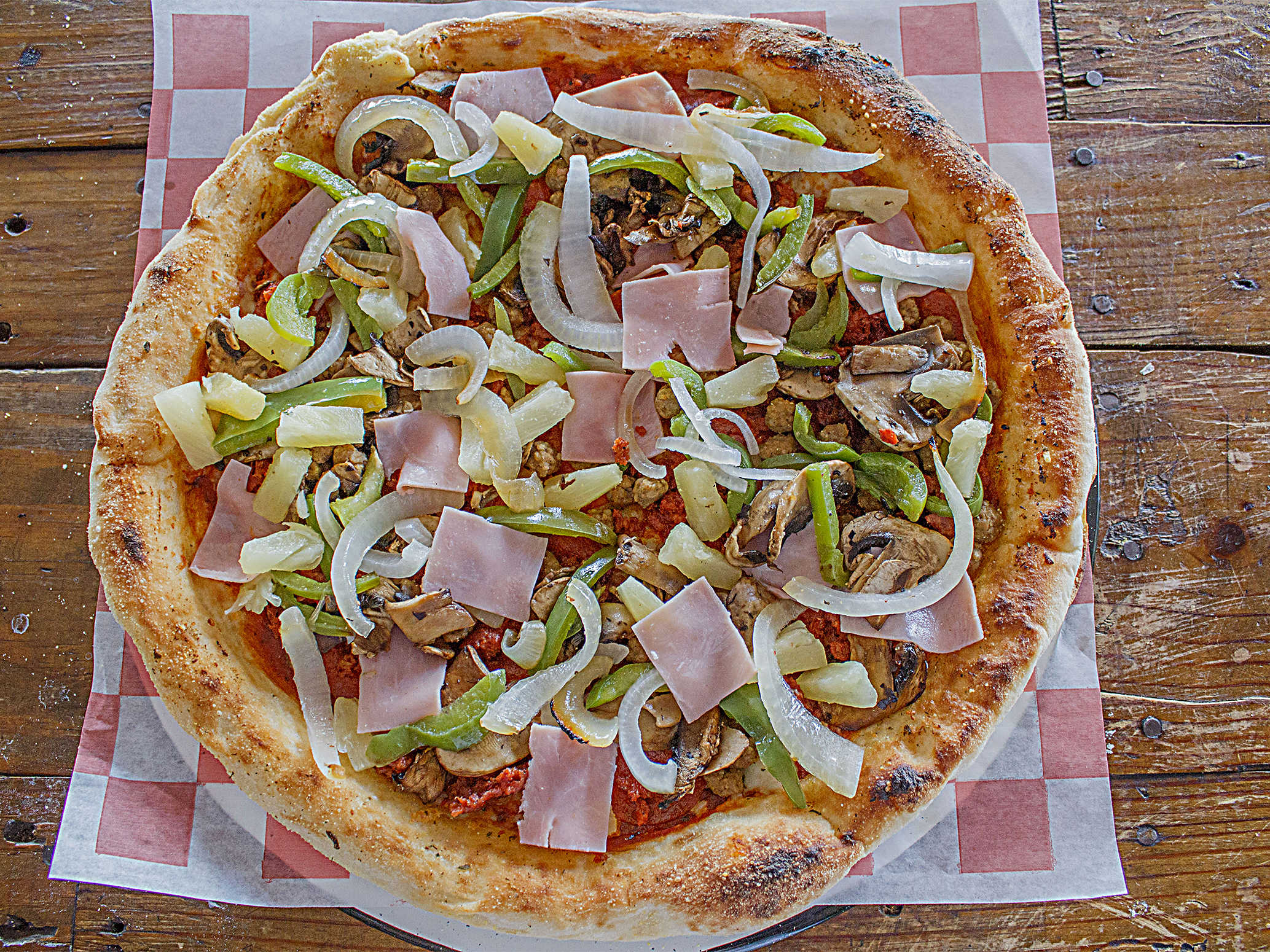 Masaje crujiente, queso mozzarella, pepperoni, jamón, piña, champiñones, chorizo, cebolla, pimento verde, marinara casera.