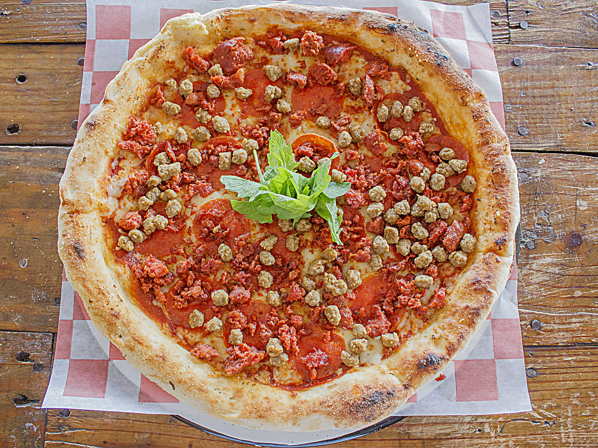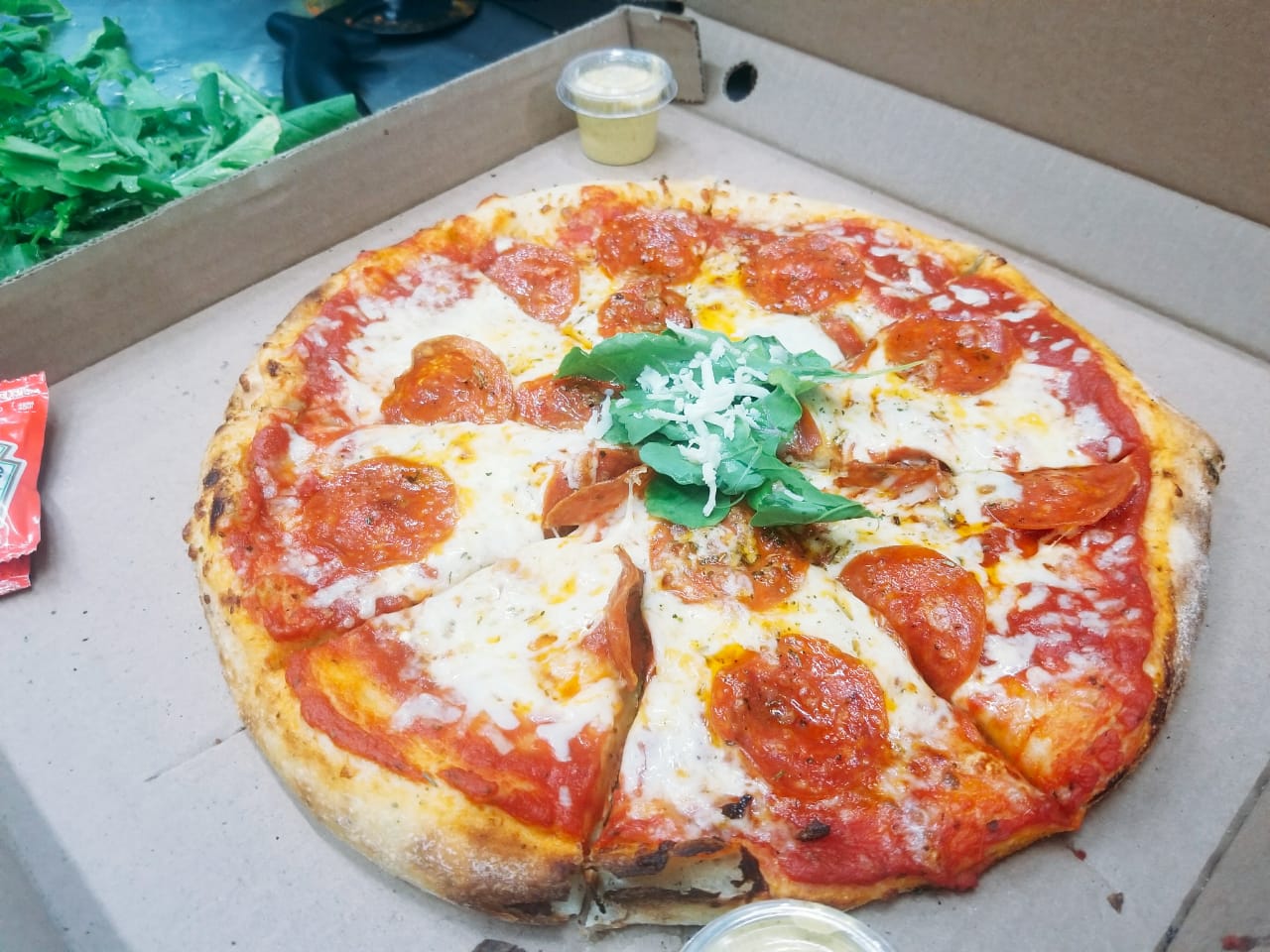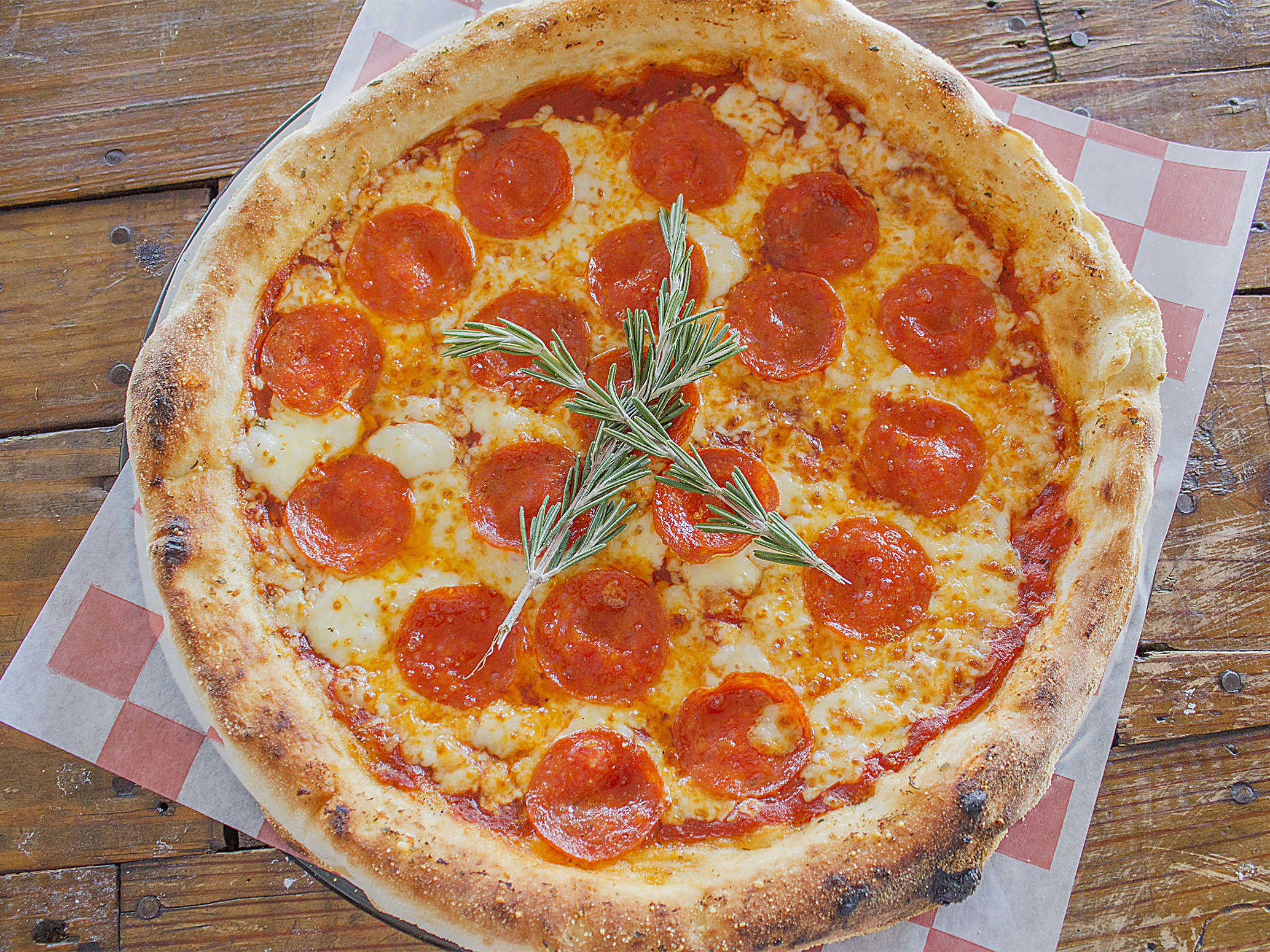 Masa crujiente, queso mozarella, peperoni, marinara casera