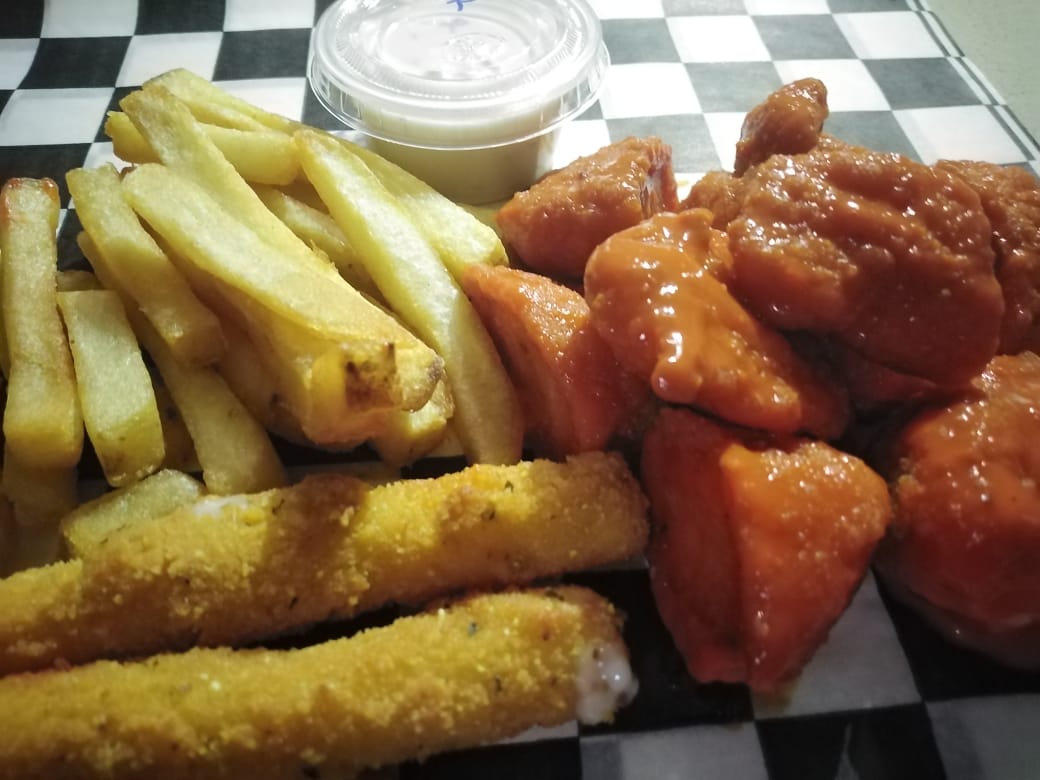 270 grms de alitas, 250 gramos de boneless, 4 dedos de queso, orden de papas a la francesa, aderezo ranch, verdura mixta