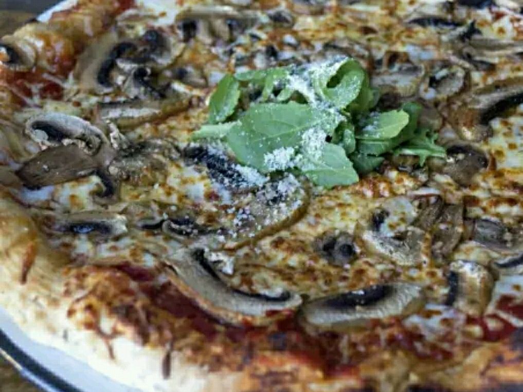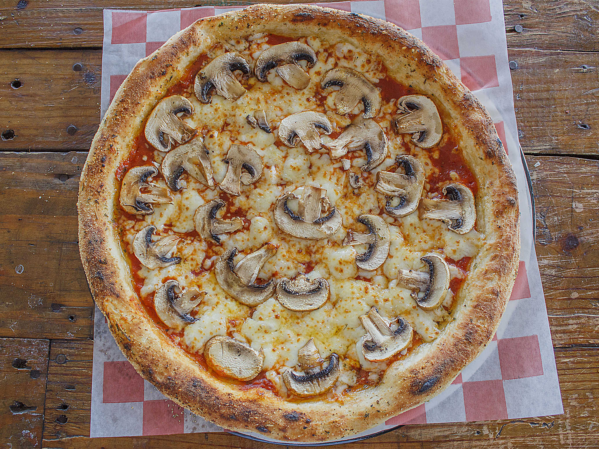 Masa crujiente, queso mozzarella, champiñones, marinara casera