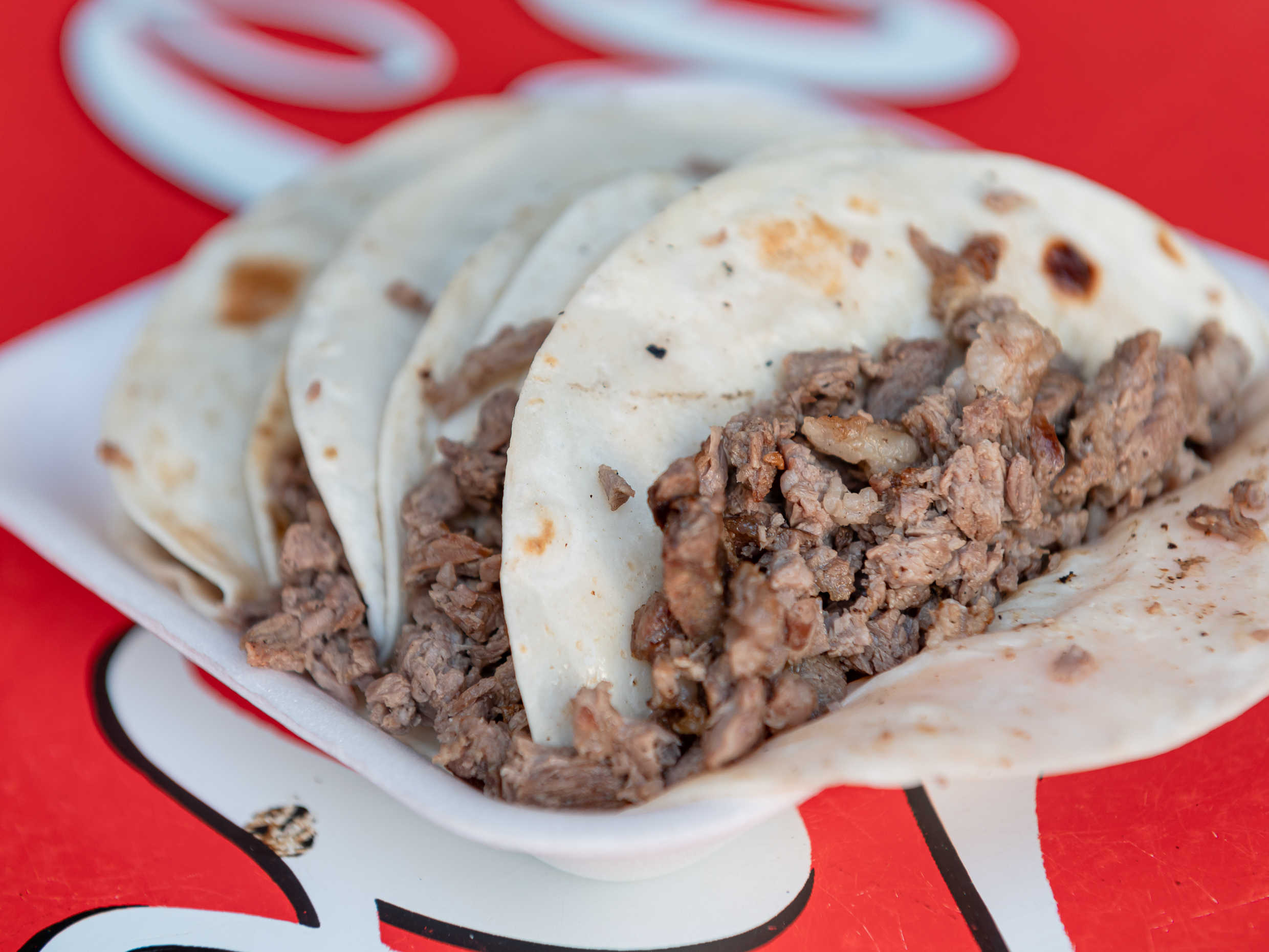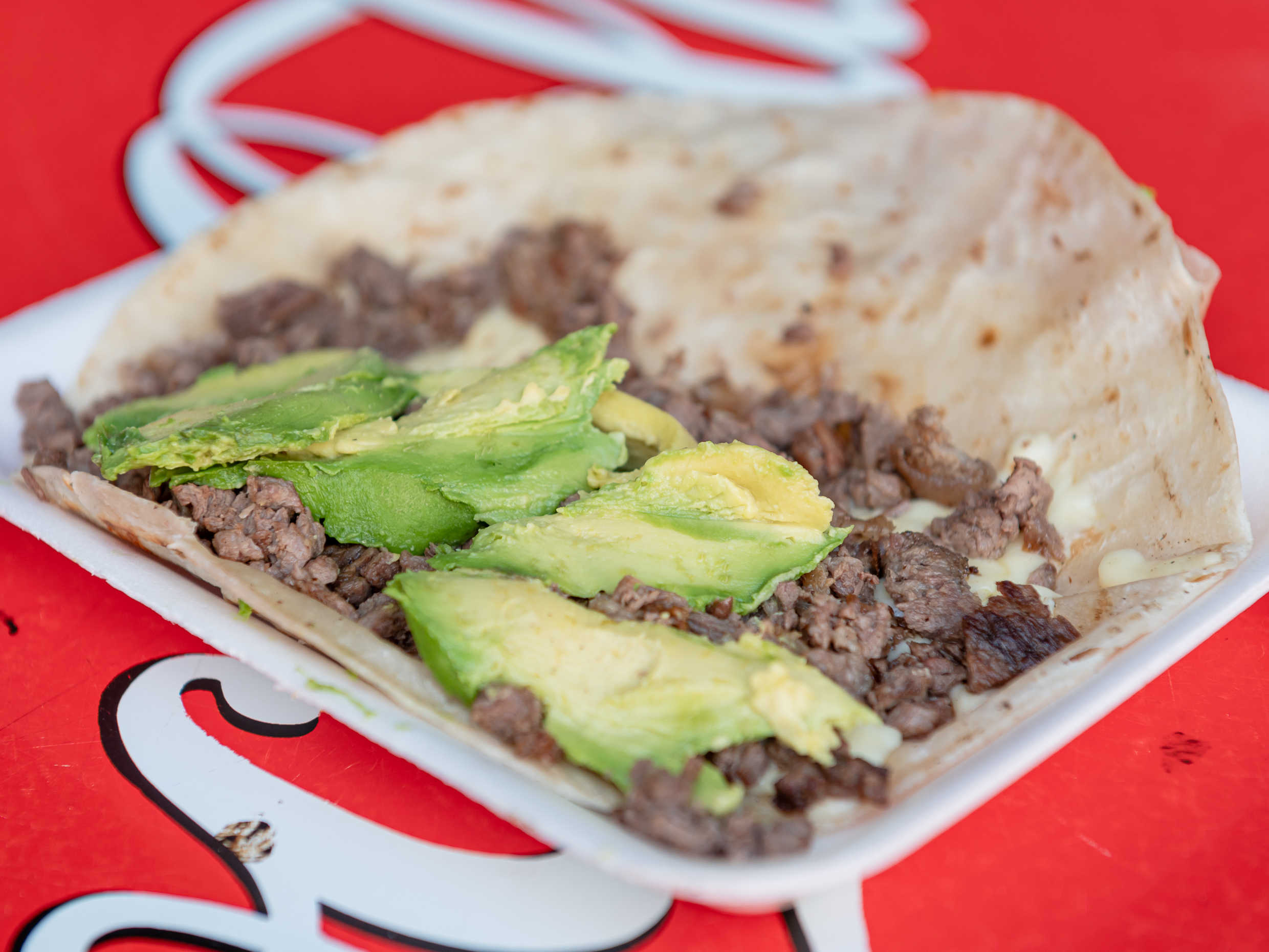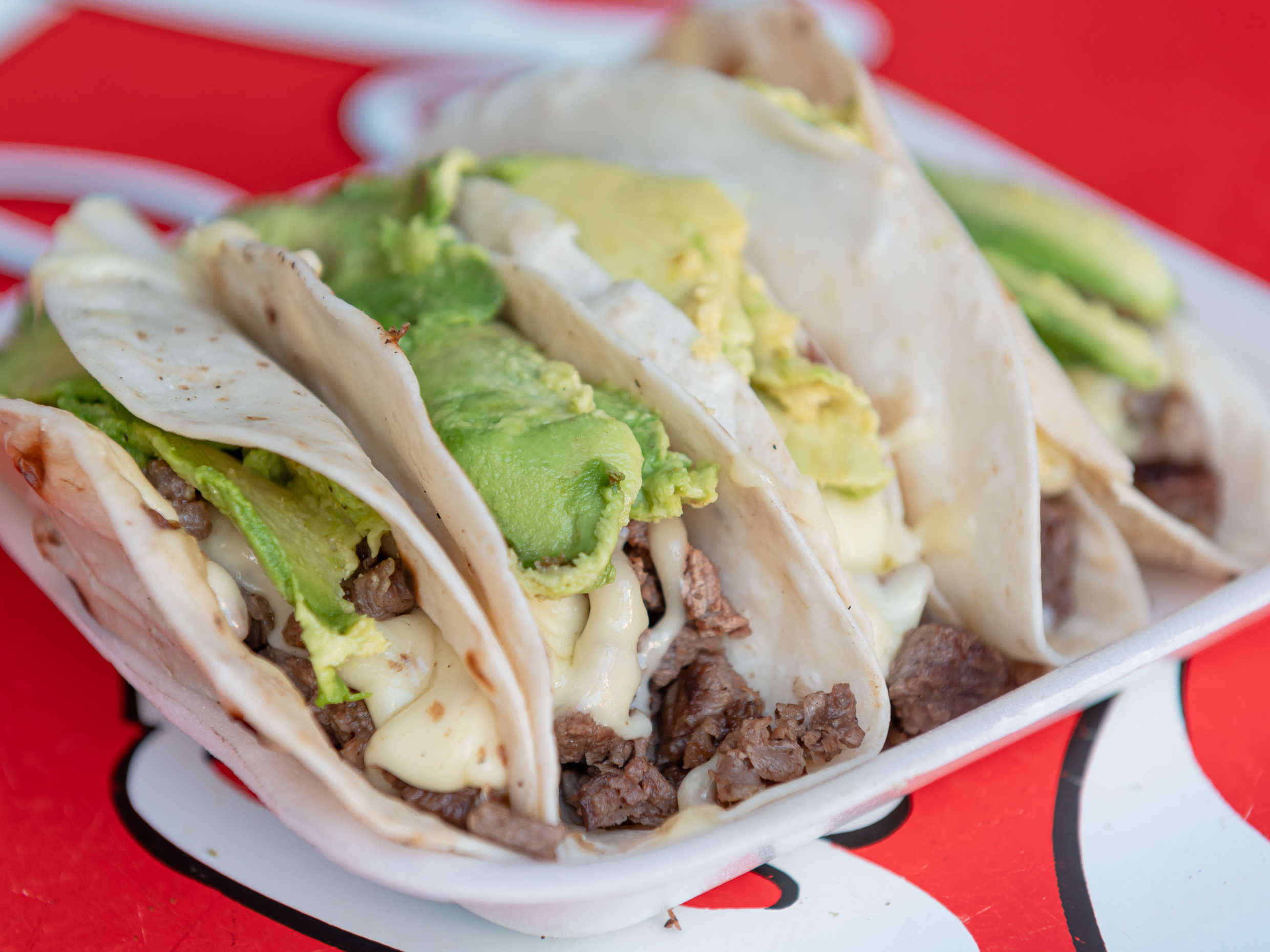 Orden de 5 tacos de carne asada con queso gratinado y aguacate en harina o maíz.