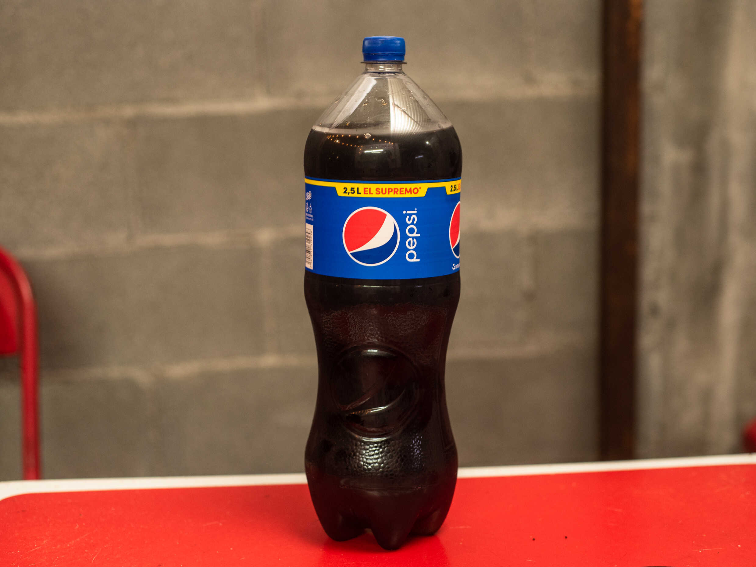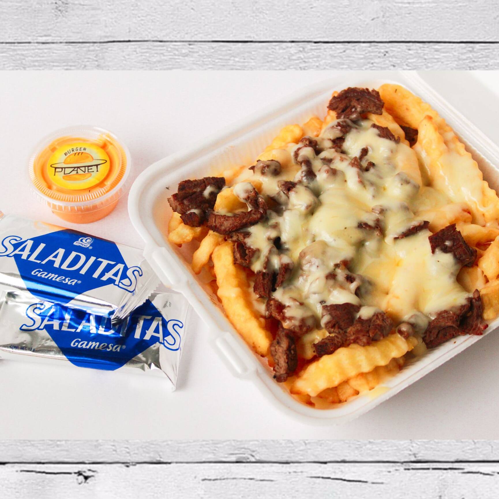 Tres hamburguesas especiales, unas papas con queso y carne grande y un refresco de 2.5 litros.