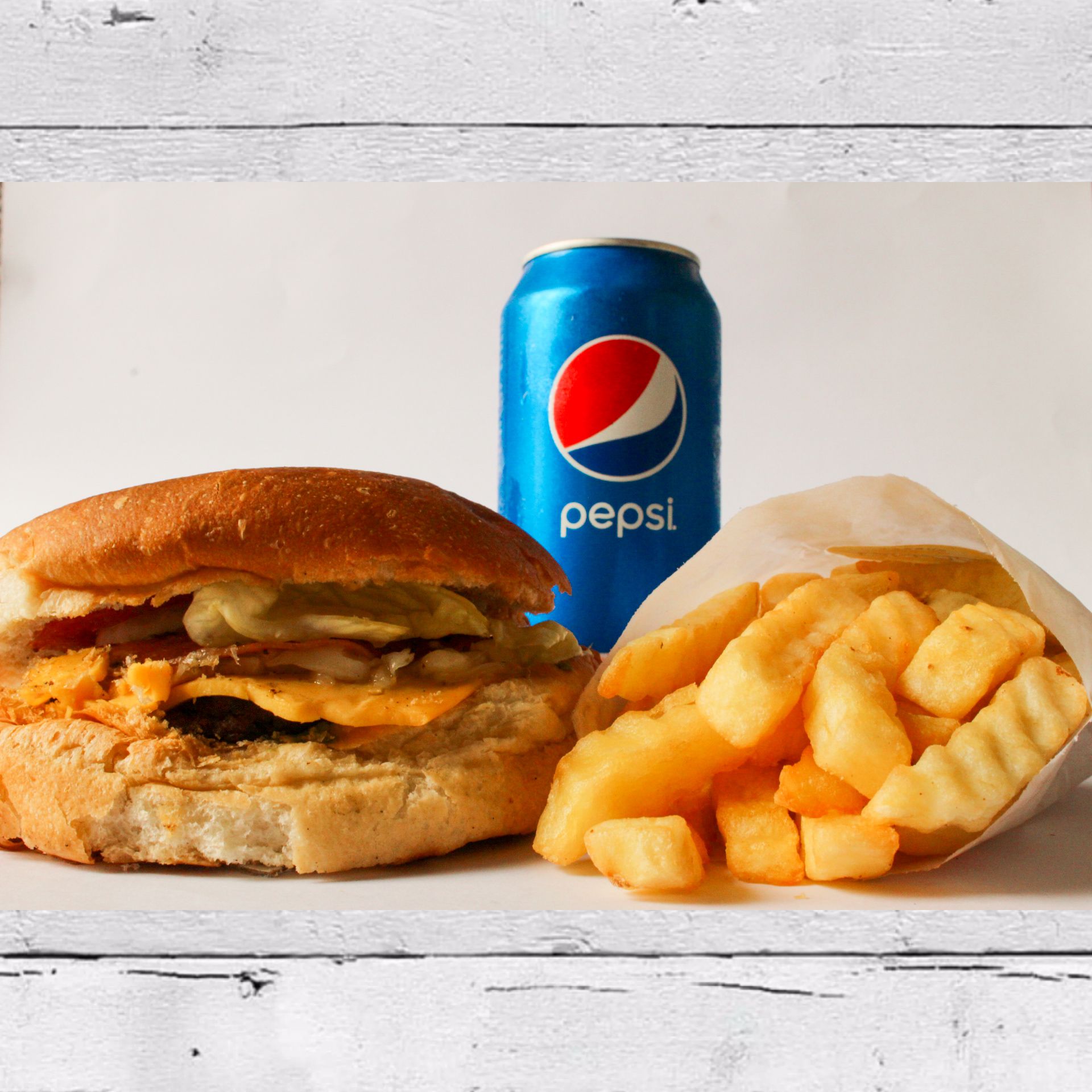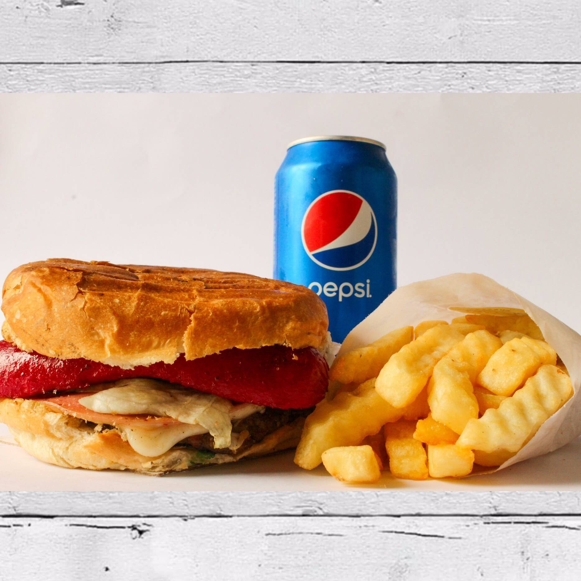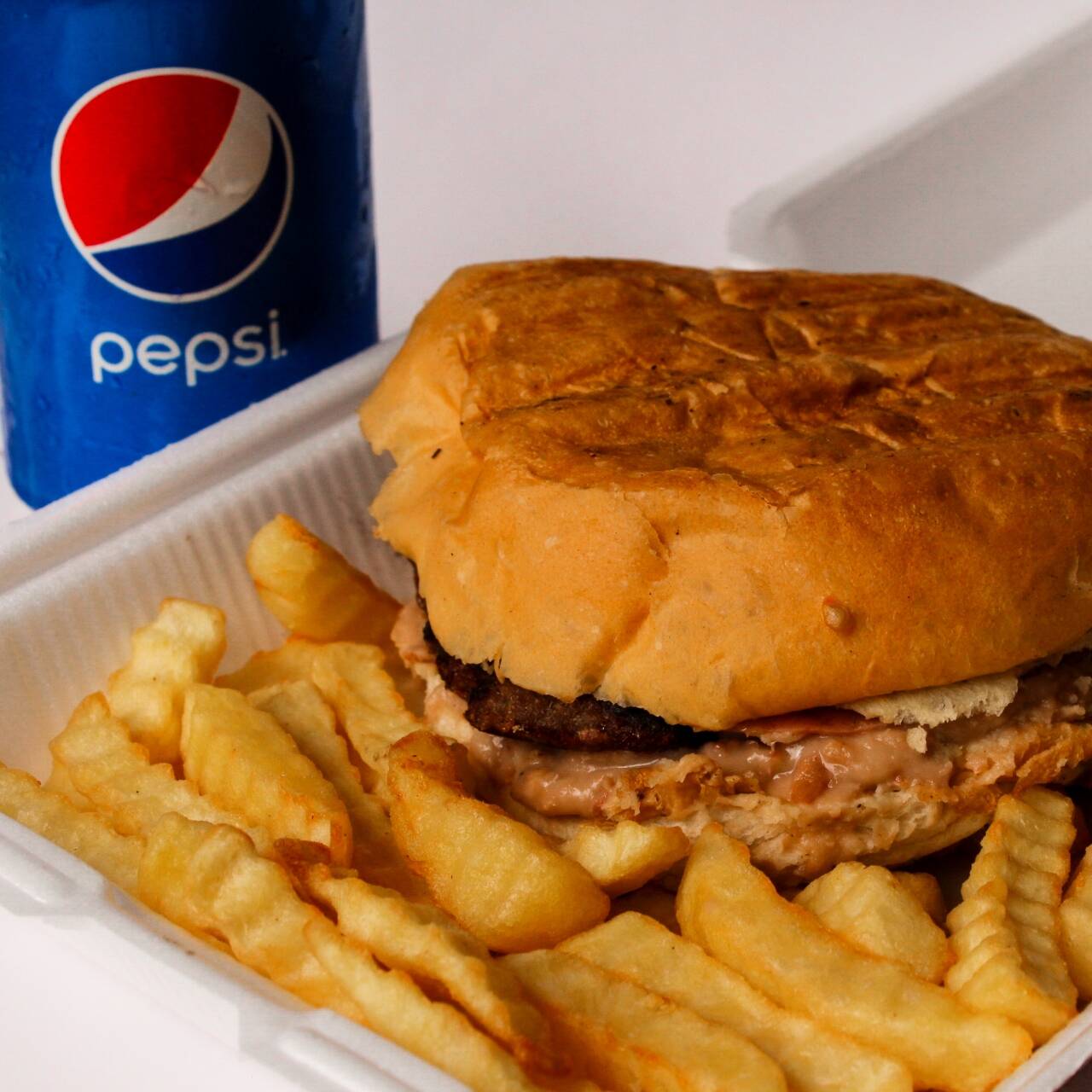 Hamburguesa especial, 150 grs de papas fritas y refresco de 400 mlt.