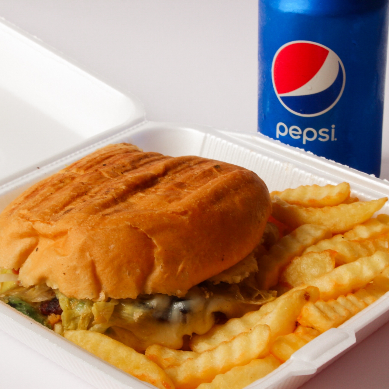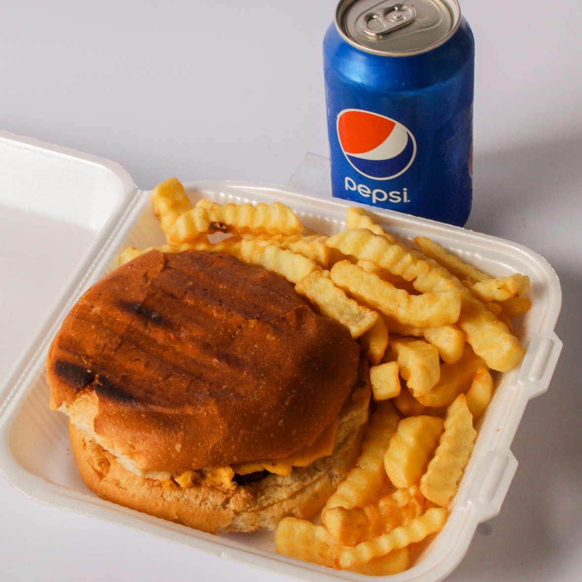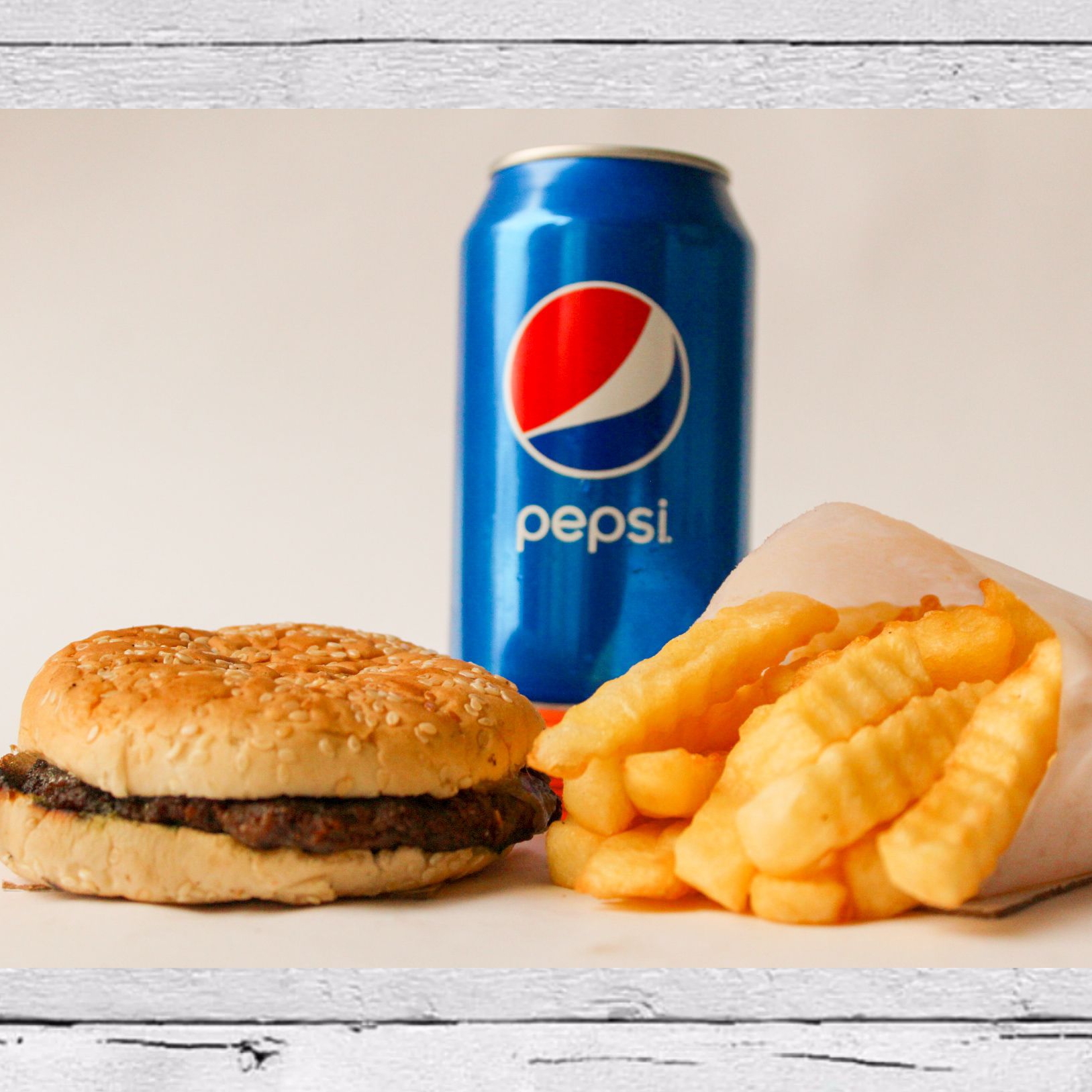 Hamburguesa especial, 150 grs de papas fritas y refresco de 400 mlt.