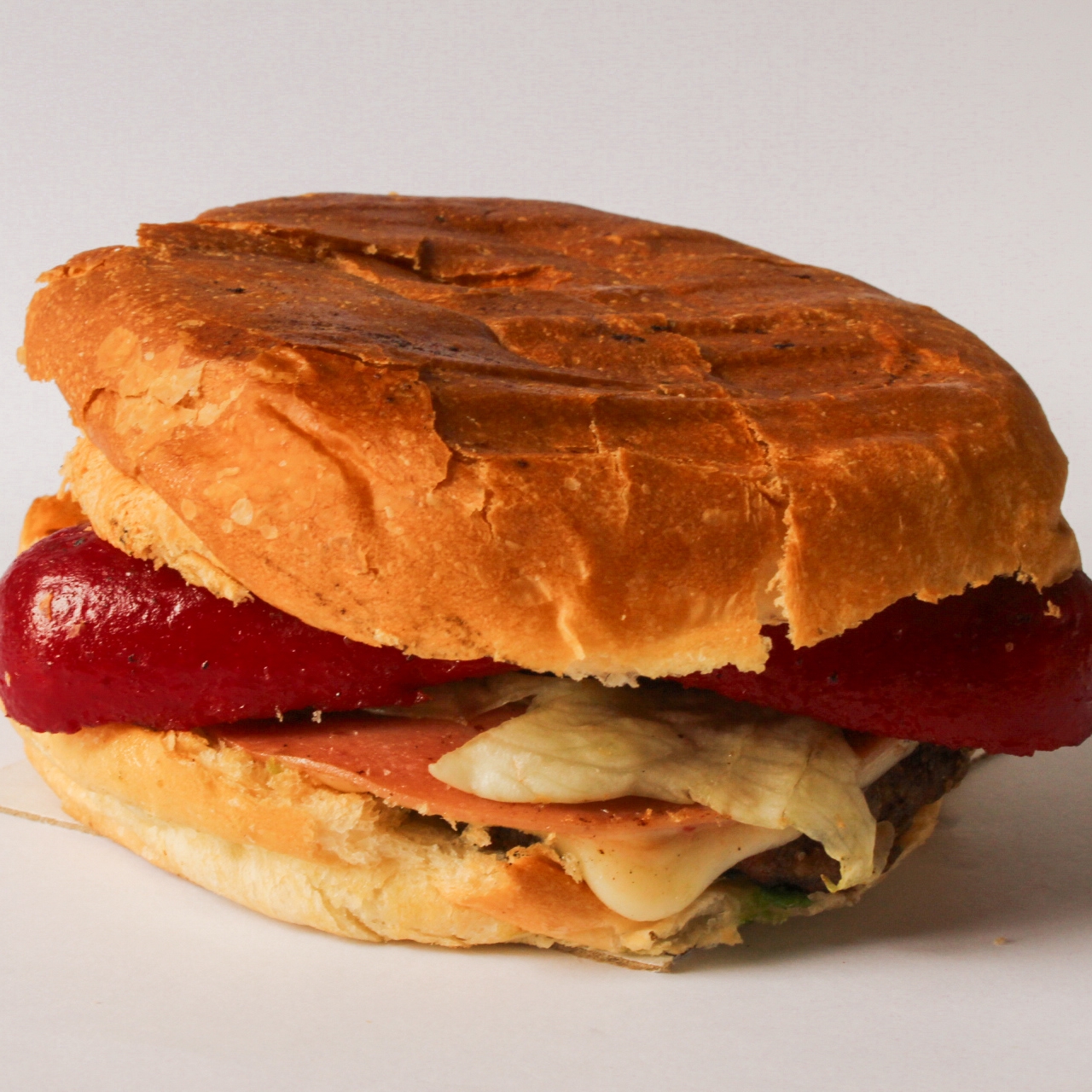 Carne, jamón, queso blanco, tomate, cebolla, lechuga, mayonesa, mostaza y cátsup.