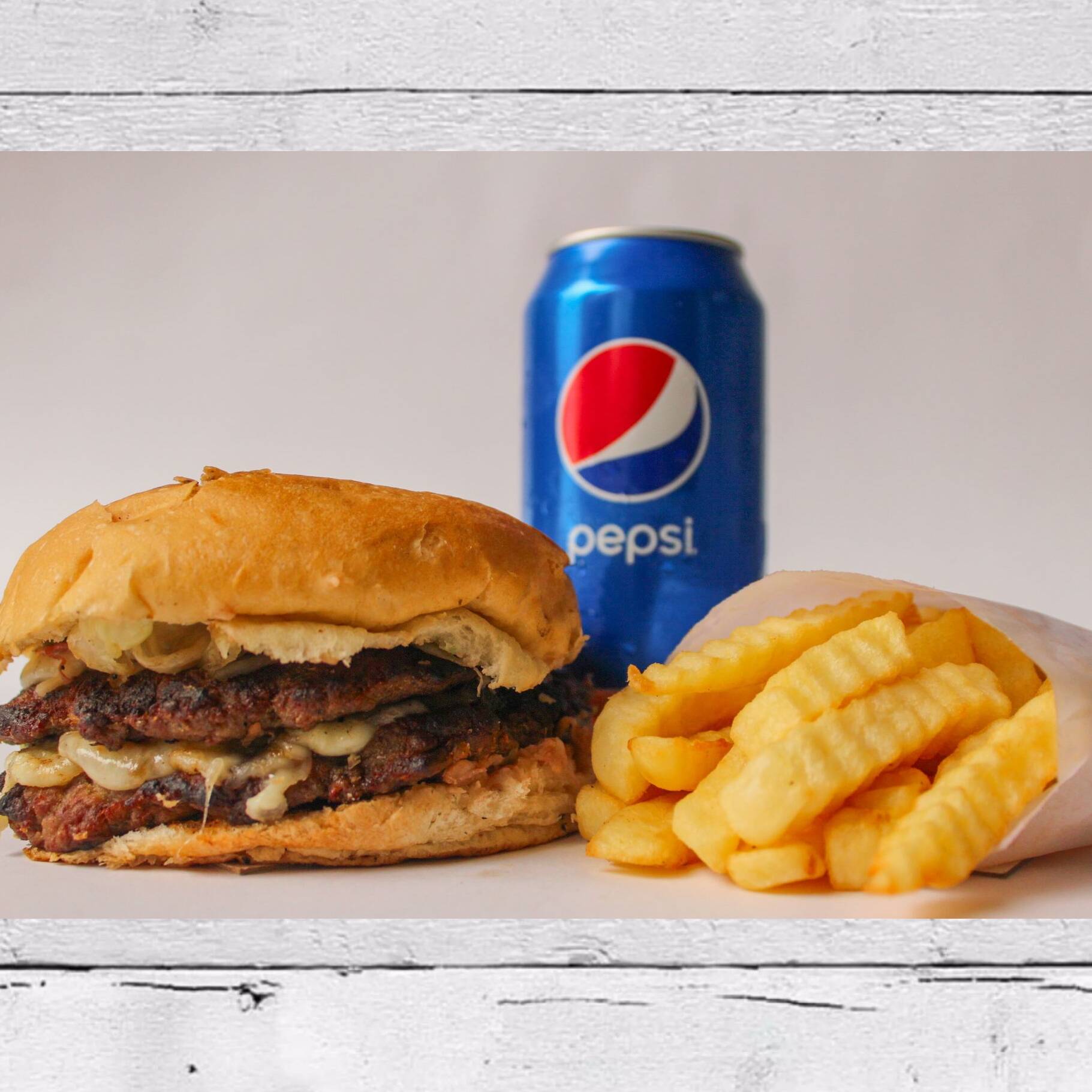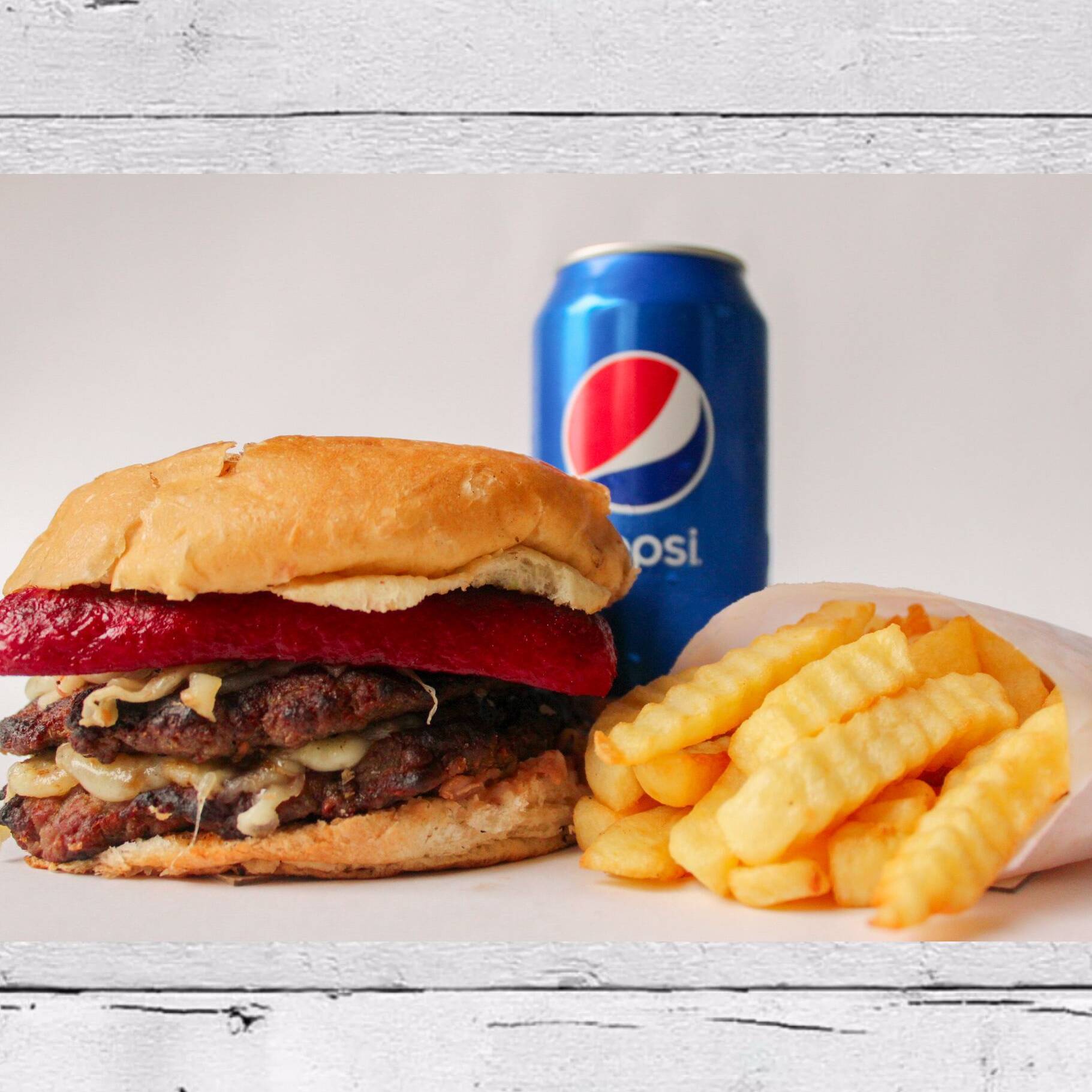 Hamburguesa doble suprema, papas y refresco de 355 ml.